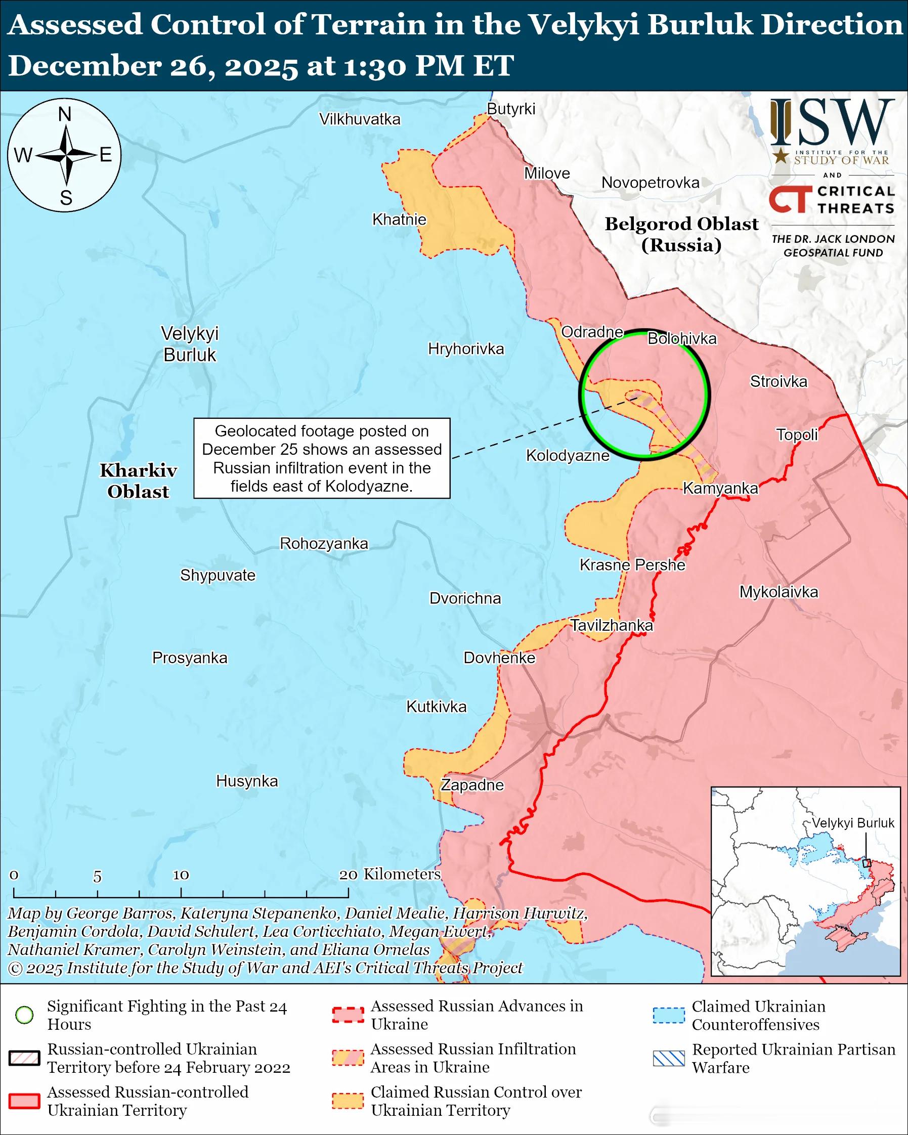 俄罗斯主要行动:乌克兰东部俄军主要行动1俄罗斯的目标:将乌克兰军队从与别尔哥罗德州接壤的国际边界击退,并使其进入哈尔科夫市的火炮射程之内。12月25日和26日,俄军继续在哈尔科夫州北部发动进攻行动,但没有取得进展。12月24日、25日和26日,俄军攻击了哈尔科夫市东北部的比尔恰、普里利普卡、沃夫昌斯基库托里、沃夫昌斯克、斯塔里齐亚和莱曼附近,并向比利科洛迪亚兹、瑟米尼夫卡和伊兹比茨克进发。12月25日在哈尔科夫方向作战的乌军旅报告称,俄军正在使用小股渗透战术,并借助无人机和滑翔炸弹,试图在维尔恰郊区站稳脚跟。在沃夫昌斯克方向作战的乌军旅发言人报告称,零度以下的冬季气温正在削弱俄乌双方的无人机行动,但并未阻止俄军的进攻。据称隶属于俄北方集团军的一位军事博主声称,俄第245摩步团(隶属莫斯科军区近卫第1坦克集团军第47坦克师),在隶属第47坦克师的第347摩步团和隶属东部军区第68集团军的第1472摩步团的增援下,试图夺取巴拉尼夫卡和巴索韦(均位于哈尔科夫市西北部)。该军事博主声称,第245摩步团第3营在巴拉尼夫卡附近的进攻中遭受重大损失后撤退。该军事博主还声称,俄军在巴索韦以北的进攻也以失败告终。这位军事博主声称,尽管遭受持续损失,俄军指挥部仍在继续下令推进,而且俄军部队正在经历人员和纪律问题,包括拒绝战斗和擅离职守(AWOL)事件。战斗序列:据报道俄第 34 独立摩步旅(第 49 合成集团军 [CAA],南部军区 [SMD])正在炮击哈尔科夫州的乌克兰阵地。12月25日和26日俄军继续在韦利基布尔卢克方向发动进攻,但没有取得确切进展。评估俄军渗透:12 月 25 日发布的地理定位视频显示,俄军在德沃里昌斯克(大布尔卢克东南)以南活动,ISW 评估认为这是一次俄军渗透任务。未经证实的说法:一位俄罗斯军事博主声称,俄军向奥德拉德涅以西(大布尔卢克以东)推进。12月24至26日,俄军在米洛韦和哈特涅附近的大布尔卢克东北部、德沃里昌斯克附近的大布尔卢克东部以及格里霍里夫卡方向进攻,并在科洛迪亚兹涅附近的大布尔卢克东南部进攻。