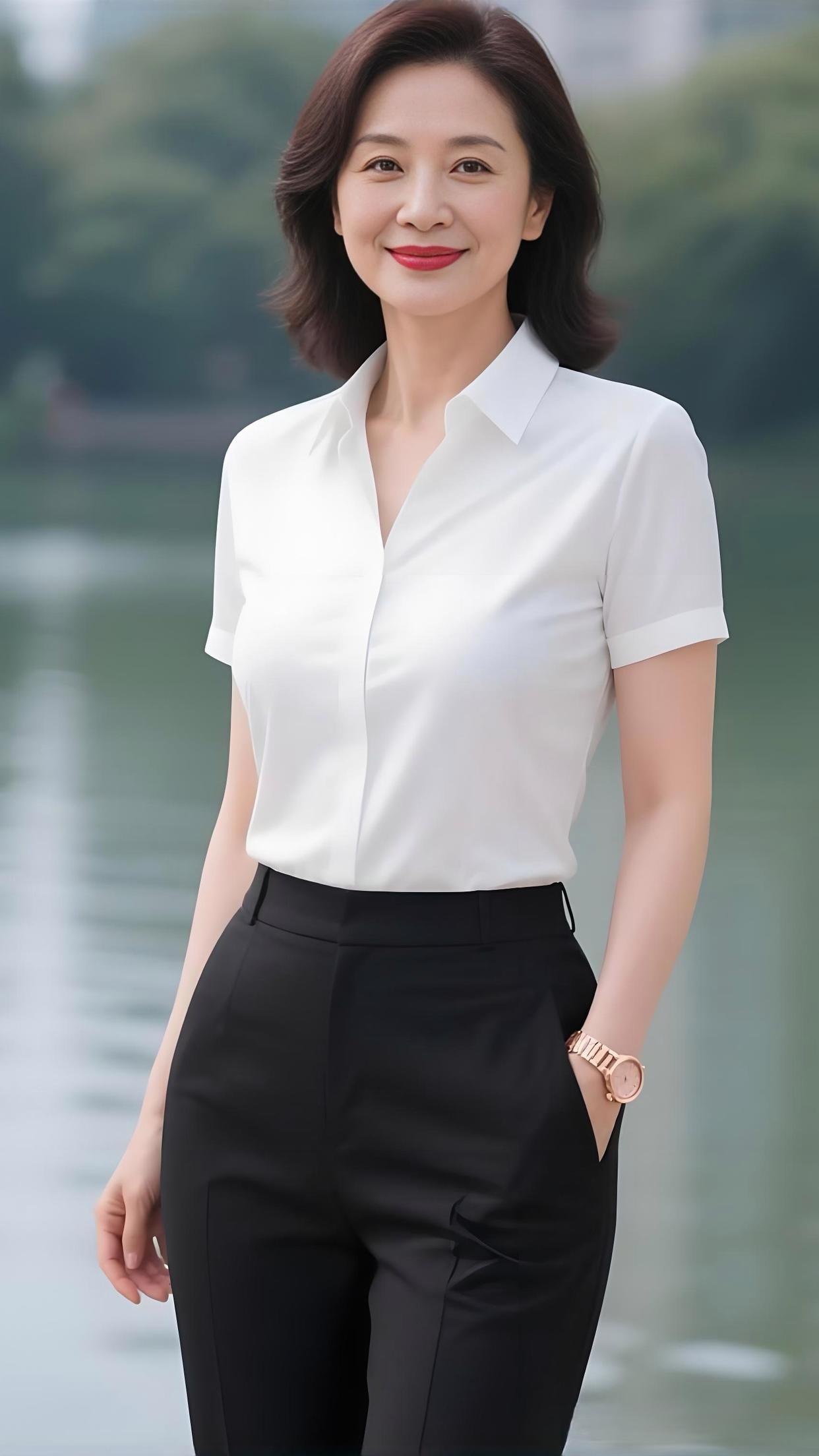 优雅职场风,白衬衫黑裤,自信微笑,魅力无限!