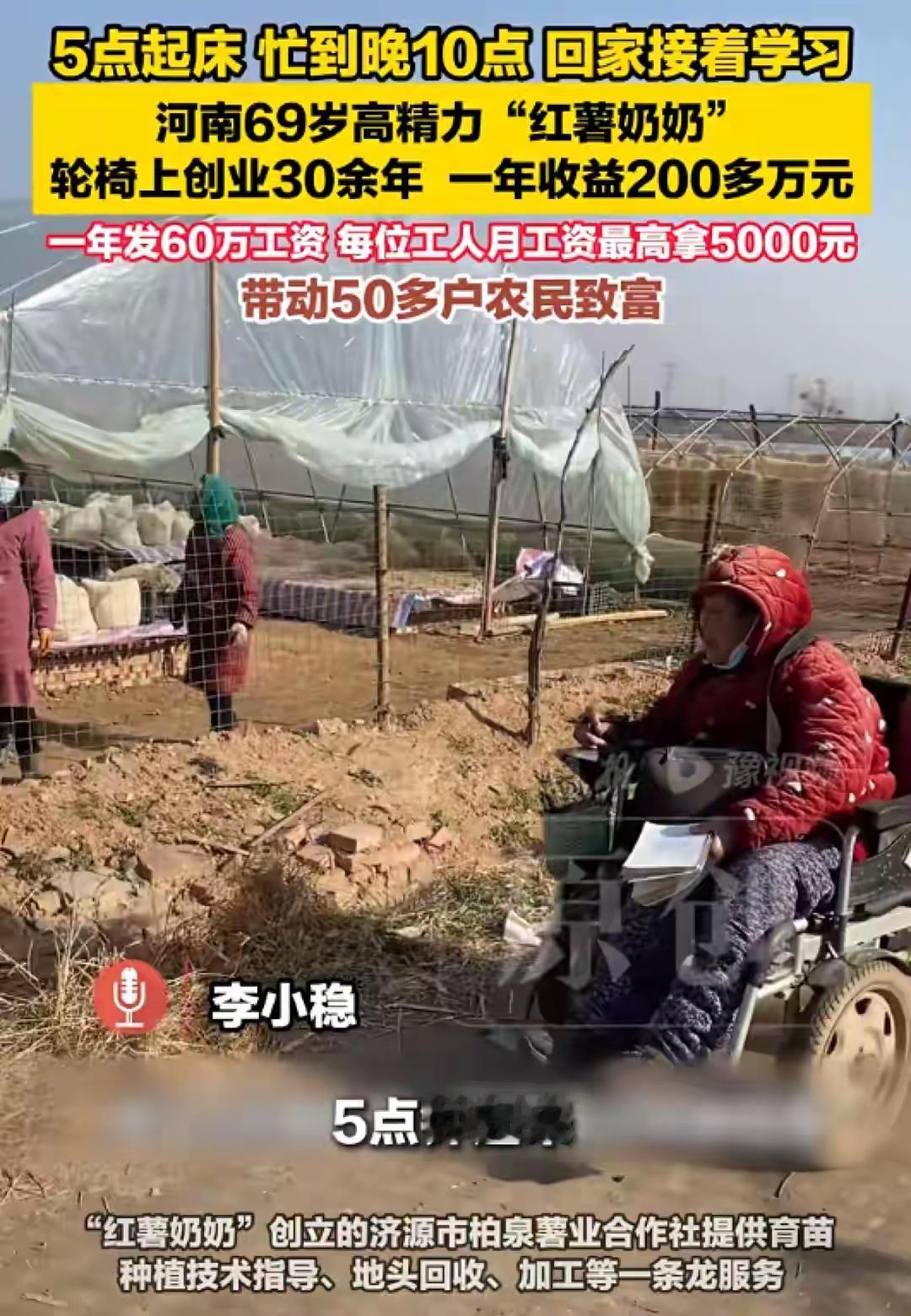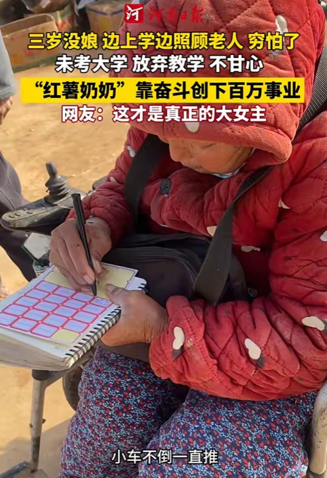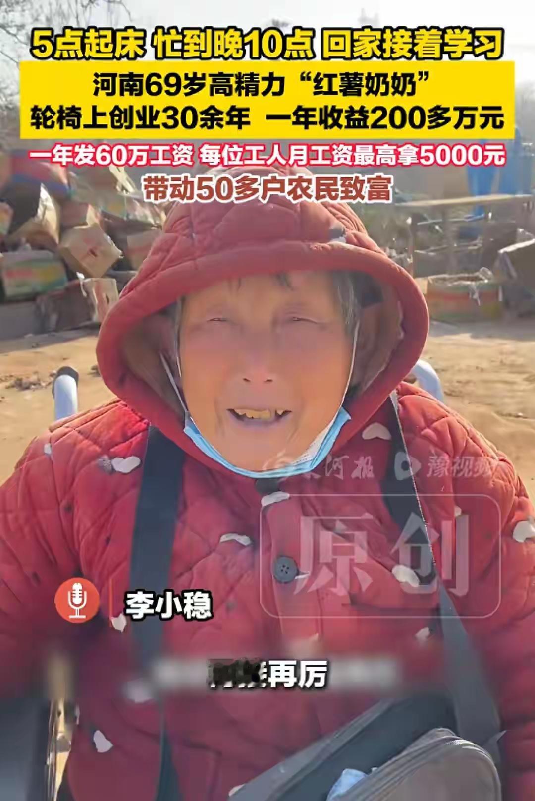 河南69岁"红薯奶奶"轮椅上创业30余年,一年收益200多万元,网友:愚公老家的“愚婆”,把年轻人卷麻了 河南69岁的“红薯奶奶”,轮椅上坚持创业30余年,一年竟然能赚到200多万元!这样的故事,谁能不被打动?有人说,她是“愚公老家的愚婆”,把年轻人都“卷麻了”。但真的是“愚公精神”在作祟,还是我们对“成功”的定义太狭隘?让我们一探究竟。 这位奶奶,没有华丽的创业背景,没有高大上的投资项目,更没有“互联网+”的助力,她用一辆轮椅,坚守在红薯摊前,几十年如一日。有人会觉得她“傻”,甚至“固执”,但更多的人看到了她身上的那股韧劲和坚持。她用实际行动告诉我们:成功,从来都不是一夜之间的奇迹,而是日复一日的坚持与努力。 你是否曾想过,为什么有人可以在风雨中屹立不倒?为什么有人能在逆境中找到希望?答案很简单:那是因为他们心中有信仰,有坚持。奶奶的轮椅不仅仅是身体的限制,更像是一面旗帜,激励着她不断前行。她用行动证明:年龄、身体条件都不是阻碍,只要有梦想,就有无限可能。 网友们纷纷评论:“愚公老家的愚婆,把年轻人都卷麻了!”这句话看似调侃,实则隐藏着深意。她用行动挑战了社会对“成功”的偏见——不一定要高学历、富二代、明星光环,平凡的人也能创造非凡。她的故事,像一股清流,冲破了社会的偏见,让我们重新审视“努力”和“坚持”的意义。 或许,我们每个人都在追逐“更好的生活”,但真正的幸福,不一定是金钱的堆积,而是那份坚持的力量。她用30年的坚守,换来了丰厚的回报,也让我们明白:只要心怀梦想,哪怕身处轮椅,也能舞出精彩人生。 这位奶奶的故事,激励着无数像她一样的普通人:无论你身处何地,遇到什么困难,只要不放弃,就有希望。她告诉我们:成功的秘诀,就是坚持不懈,永不言弃。或许,我们每个人都可以成为自己人生的“红薯奶奶”,用汗水和坚持,写出属于自己的辉煌篇章。 所以,下次当你觉得自己无法前行时,想想这位“红薯奶奶”。她用行动告诉我们:没有什么可以阻挡一个有梦想、肯坚持的灵魂。只要心中有光,就没有到达不了的远方。