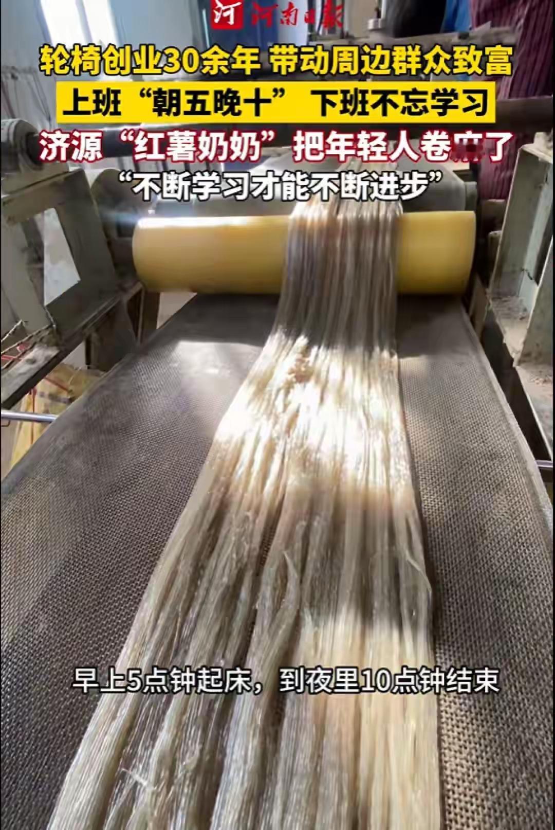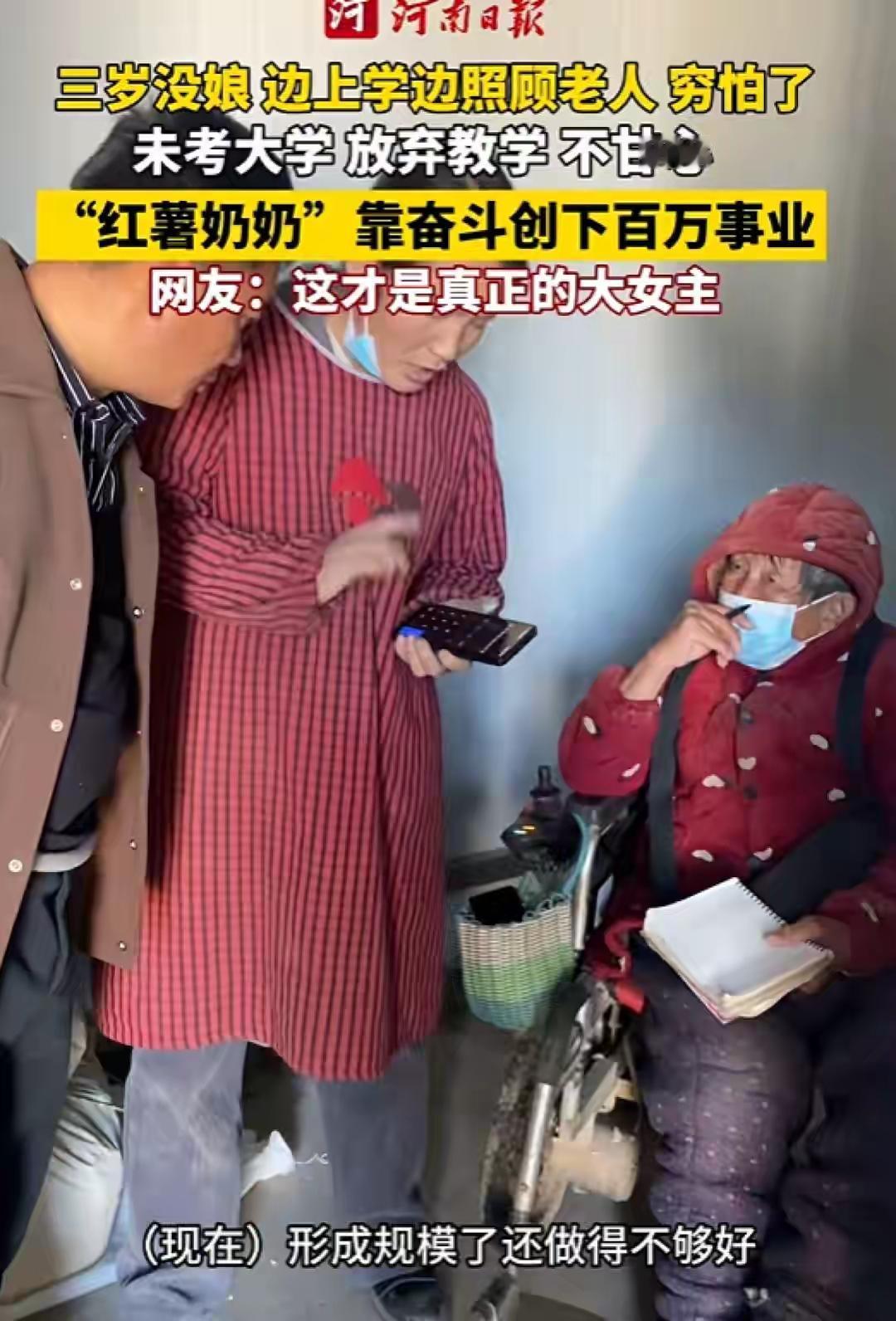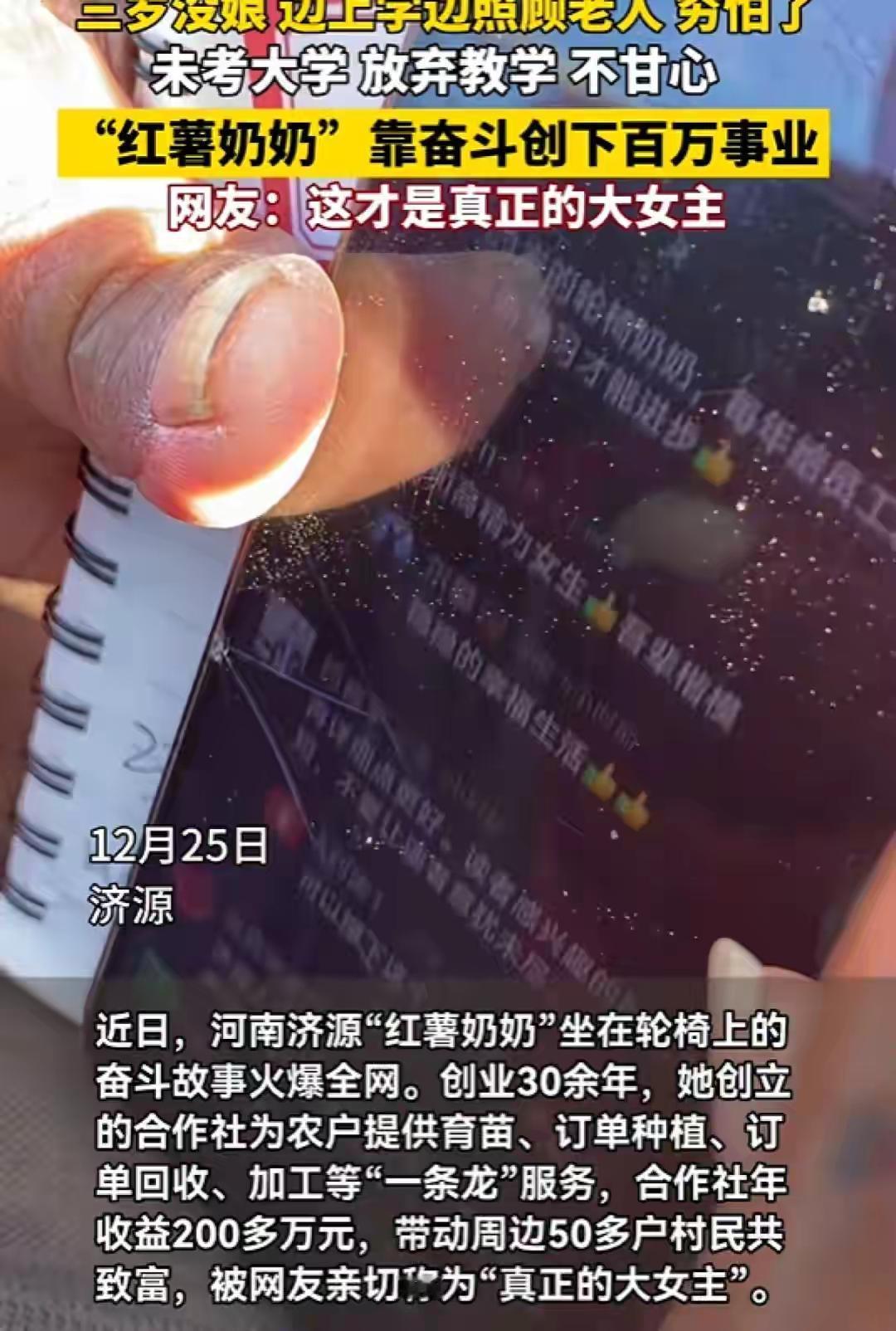 河南69岁"红薯奶奶"轮椅上创业30余年,一年收益200多万元,网友:愚公老家的“愚婆”,把年轻人卷麻了 河南69岁的“红薯奶奶”,轮椅上坚持创业30余年,一年竟然能赚到200多万元!这样的故事,谁能不被打动?有人说,她是“愚公老家的愚婆”,把年轻人都“卷麻了”。但真的是“愚公精神”在作祟,还是我们对“成功”的定义太狭隘?让我们一探究竟。 这位奶奶,没有华丽的创业背景,没有高大上的投资项目,更没有“互联网+”的助力,她用一辆轮椅,坚守在红薯摊前,几十年如一日。有人会觉得她“傻”,甚至“固执”,但更多的人看到了她身上的那股韧劲和坚持。她用实际行动告诉我们:成功,从来都不是一夜之间的奇迹,而是日复一日的坚持与努力。 你是否曾想过,为什么有人可以在风雨中屹立不倒?为什么有人能在逆境中找到希望?答案很简单:那是因为他们心中有信仰,有坚持。奶奶的轮椅不仅仅是身体的限制,更像是一面旗帜,激励着她不断前行。她用行动证明:年龄、身体条件都不是阻碍,只要有梦想,就有无限可能。 网友们纷纷评论:“愚公老家的愚婆,把年轻人都卷麻了!”这句话看似调侃,实则隐藏着深意。她用行动挑战了社会对“成功”的偏见——不一定要高学历、富二代、明星光环,平凡的人也能创造非凡。她的故事,像一股清流,冲破了社会的偏见,让我们重新审视“努力”和“坚持”的意义。 或许,我们每个人都在追逐“更好的生活”,但真正的幸福,不一定是金钱的堆积,而是那份坚持的力量。她用30年的坚守,换来了丰厚的回报,也让我们明白:只要心怀梦想,哪怕身处轮椅,也能舞出精彩人生。 这位奶奶的故事,激励着无数像她一样的普通人:无论你身处何地,遇到什么困难,只要不放弃,就有希望。她告诉我们:成功的秘诀,就是坚持不懈,永不言弃。或许,我们每个人都可以成为自己人生的“红薯奶奶”,用汗水和坚持,写出属于自己的辉煌篇章。 所以,下次当你觉得自己无法前行时,想想这位“红薯奶奶”。她用行动告诉我们:没有什么可以阻挡一个有梦想、肯坚持的灵魂。只要心中有光,就没有到达不了的远方。