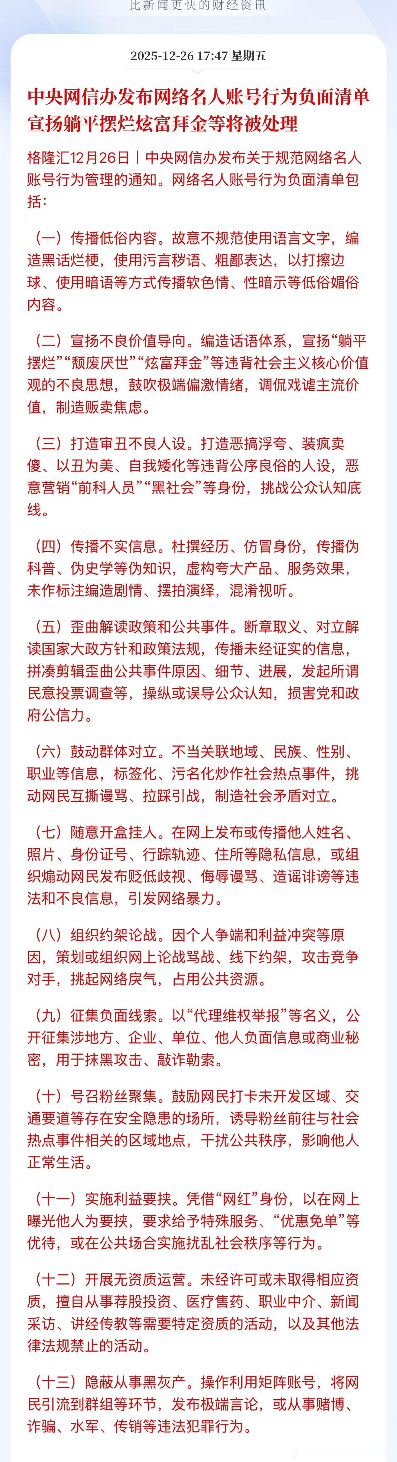 发布网络名人账号行为负面清单宣扬躺平摆烂炫富拜金等将被处理