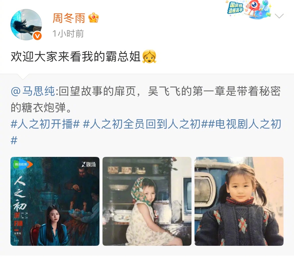 人之初你的人来了 哇趣!人之初真摇人,排面爽之!花少团那英、龚俊、张晚意、张雅琪,们影后组周冬雨、王安宇给马思纯吴飞飞上线打call,大林子郭麒麟、宋轶、李沁给张若昀高风打call,还有喜人奇妙夜的梦幻联动!做电视剧人之初 的剧粉好幸福啊啊啊,更新的四集已看完,小高风找妈妈,吴飞飞千金归来,故事节奏和叙事结构很大胆,剧情连追毫不费力,平平无奇的下饭神剧罢了请这个人之初保持这种节奏,我将永远追随你!跨年热梗制造机