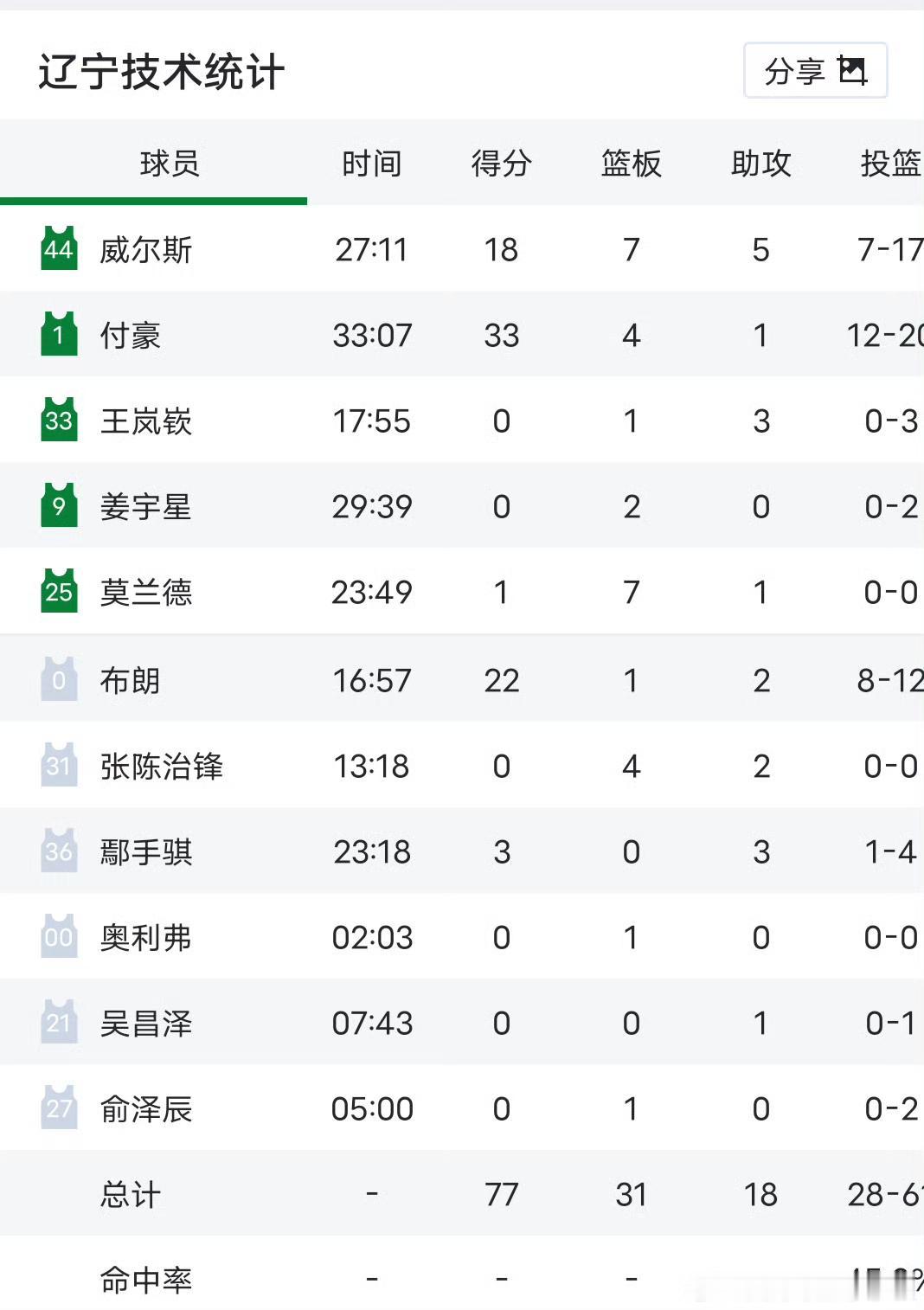 辽宁队两连败,CBA常规赛,北控81:77战胜辽宁,辽宁全队只有5人得分,付豪33分、布朗22分、威尔斯18分、鄢手骐3分、莫兰德1分。 卖掉张镇麟换来姜宇星,当时辽宁自媒体狂吹姜宇星全面比张镇麟强,张陈治锋新一代内线巨擎,开局虚火已经过去,连败的辽宁队才是真实水平,杨鸣再无心情跳拉丁舞。