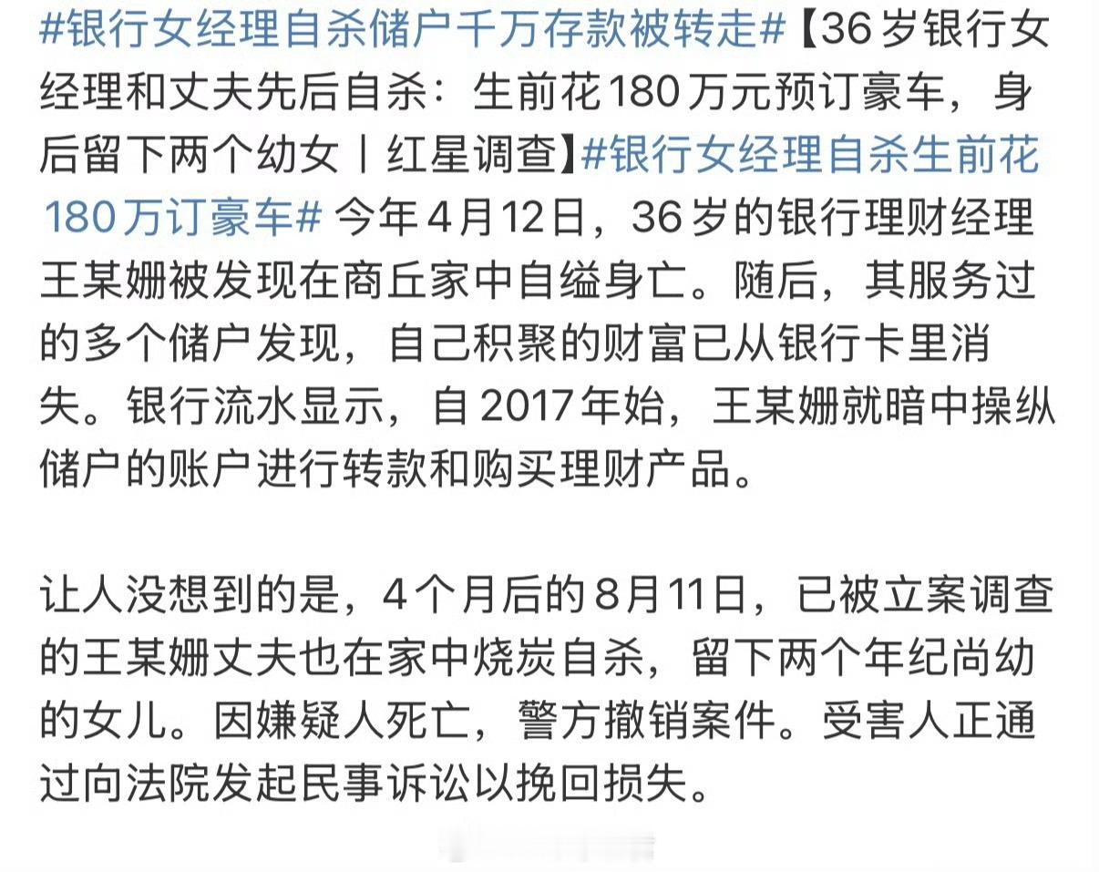 银行女经理自杀储户千万存款被转走热点解读 这起银行理财经理“监守自盗”事件,折射出金融内控失灵、绩效压力畸形化与监管责任虚化的多重黑洞,令人震惊。王某姗能自2017年起长期操纵储户账户,涉及金额高达数千万元,说明关键岗位权限过度集中,账户变更、转款、代客操作缺乏有效的“双人复核”“系统留痕”和实时预警机制。更值得警惕的是,总行虽曾发现异常交易,却未能在早期果断止损,风险处置明显滞后,最终演变为系统性伤害。这个悲剧揭示了金融从业者在高业绩、高负债、高攀比环境下的心理失衡。豪车预订、巨额消费与民间借贷交织,反映出“以业绩论英雄”的激励模式,容易诱发违规套利、以洞补洞的恶性循环。一旦东窗事发,个人、家庭与储户同时坠入深渊。因此,金融风险往往不是突然爆发,而是长期纵容的结果。应从三方面入手加强监管:其一,制度上压缩个人可操纵空间,严格岗位轮换、权限分离和穿透式审计;其二,技术上强化异常交易的自动拦截与问责倒查,杜绝“发现但不处理”;其三,治理上重塑绩效与合规并重的文化,将员工心理风险纳入管理视野。
