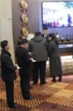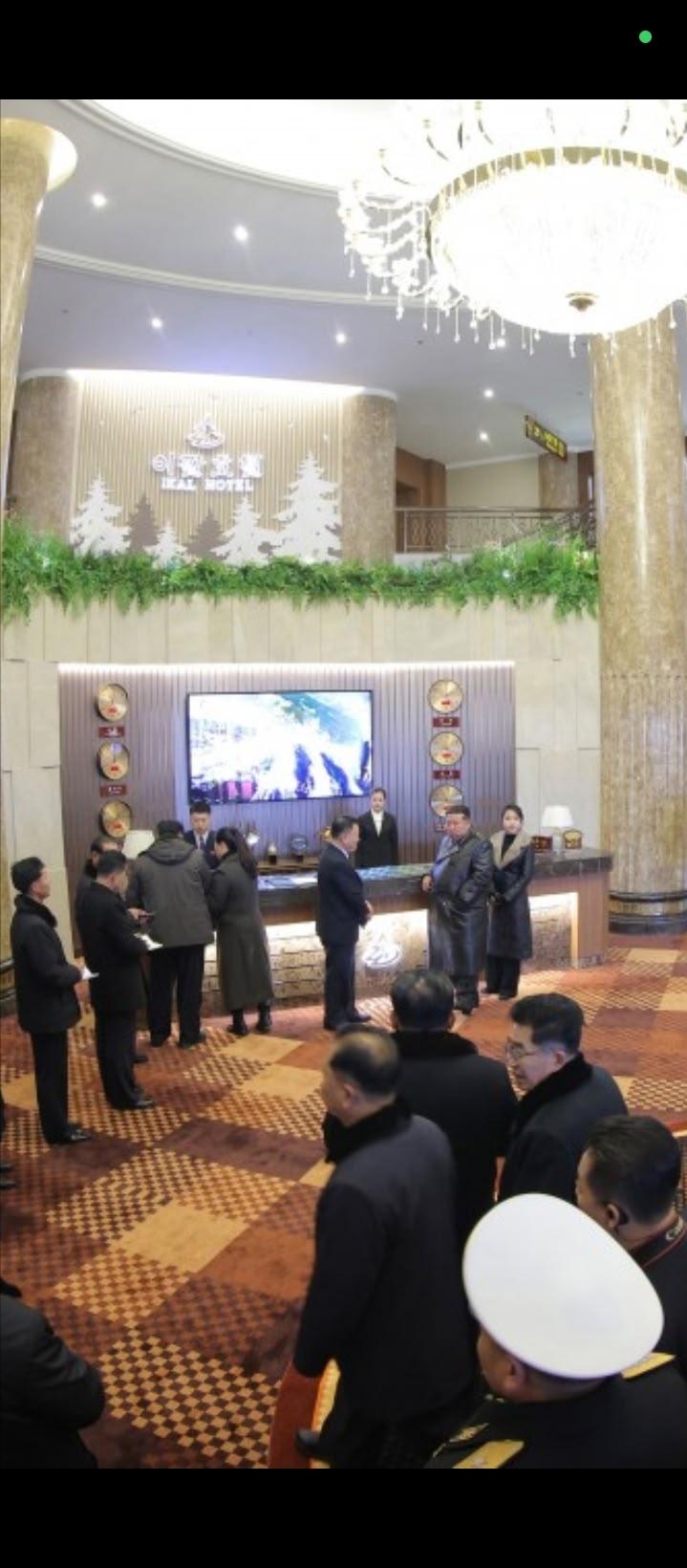 人群围站的姿态都十分收敛,显得平和有序,玄松月站在服务员跟前,好像正在做什么交涉,不知是不是在为大家在此的聚餐算账?12 月 20 日,玄松陪同元帅及其家属、朝鲜劳动党相关人士,一同出席了三池渊市多家新建酒店的落成启用仪式。场面十分温馨融洽。