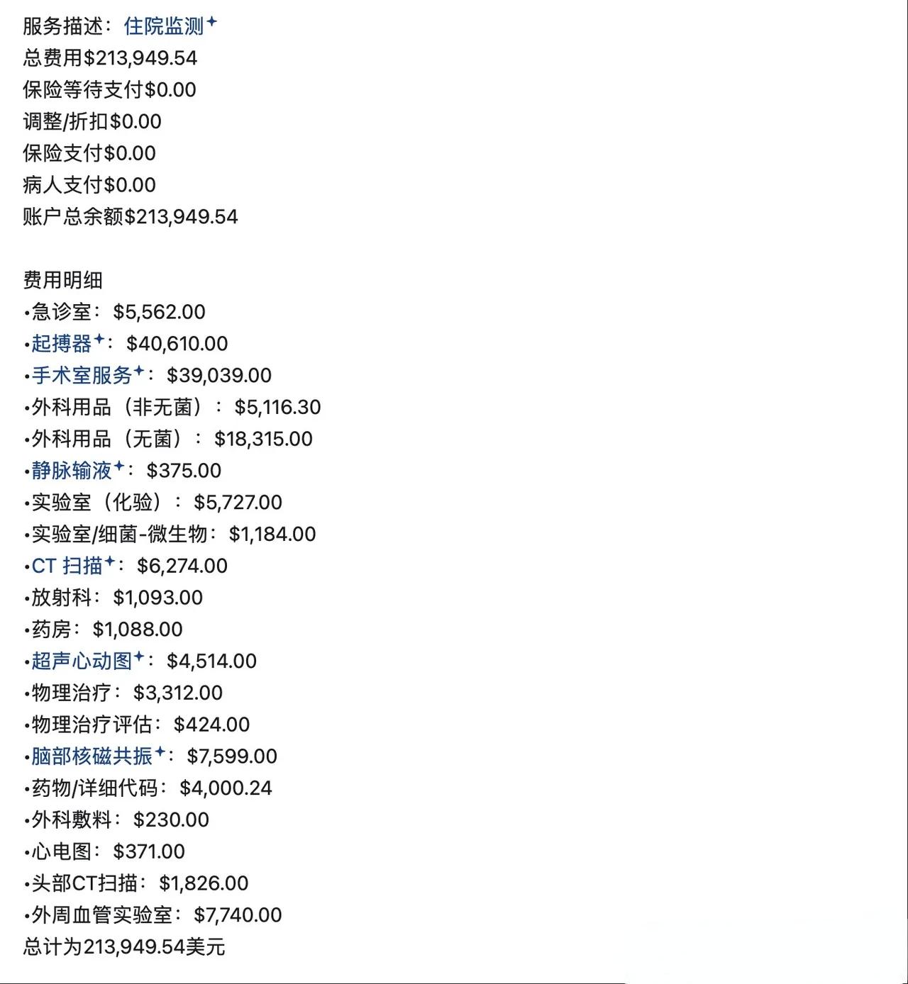 一张21万美元的医疗账单,源自一颗万圣节糖果让留学生表弟晕倒,这直接把两个留子逼到了破产的边缘——这张美国医院账单,看似离谱,却是美国医疗“斩杀线”最真实的写照。 账单上光是起搏器就标价4万多美元,手术室服务近4万,连一瓶静脉输液都要375美元,更讽刺的是,这还只是医院账单,救护车、医生诊疗的费用还在路上“排队”。换算成人民币超150万的数字,不是医疗耗材镶了金,而是美国医疗体系把“生命标价”玩到了极致。 要知道,美国普通民众的医疗忍耐斩杀线早就一降再降:一场急诊就能掏空中产积蓄,一次手术就能让家庭负债累累。这两个留学生的遭遇,不过是美国医疗天价收割的缩影——在这片土地上,生命的重量,终究抵不过账单上的数字,所谓的“医疗自由”,不过是有钱人的特权,普通人只能在天价账单面前,被精准“斩杀”。