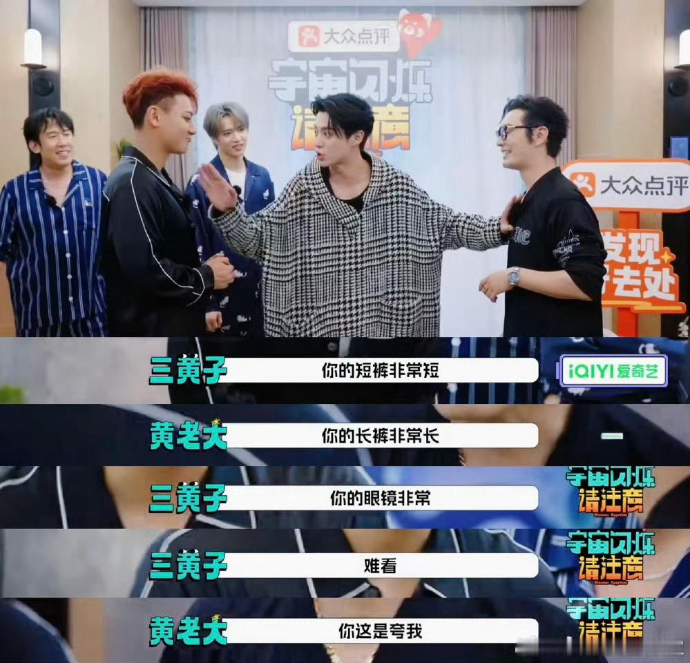 内娱男明星互怼名场面谁能想到互夸游戏还能这么玩?黄晓明和黄子韬用青岛话互夸,结果黄子韬突然翻脸:“你的眼镜非常难看!”黄晓明当场石化:“你这是夸我?”王鹤棣、刘耀文在旁边疯狂补刀,互怼比夸人还熟练,嘴比脑子还快宇宙闪烁请注意