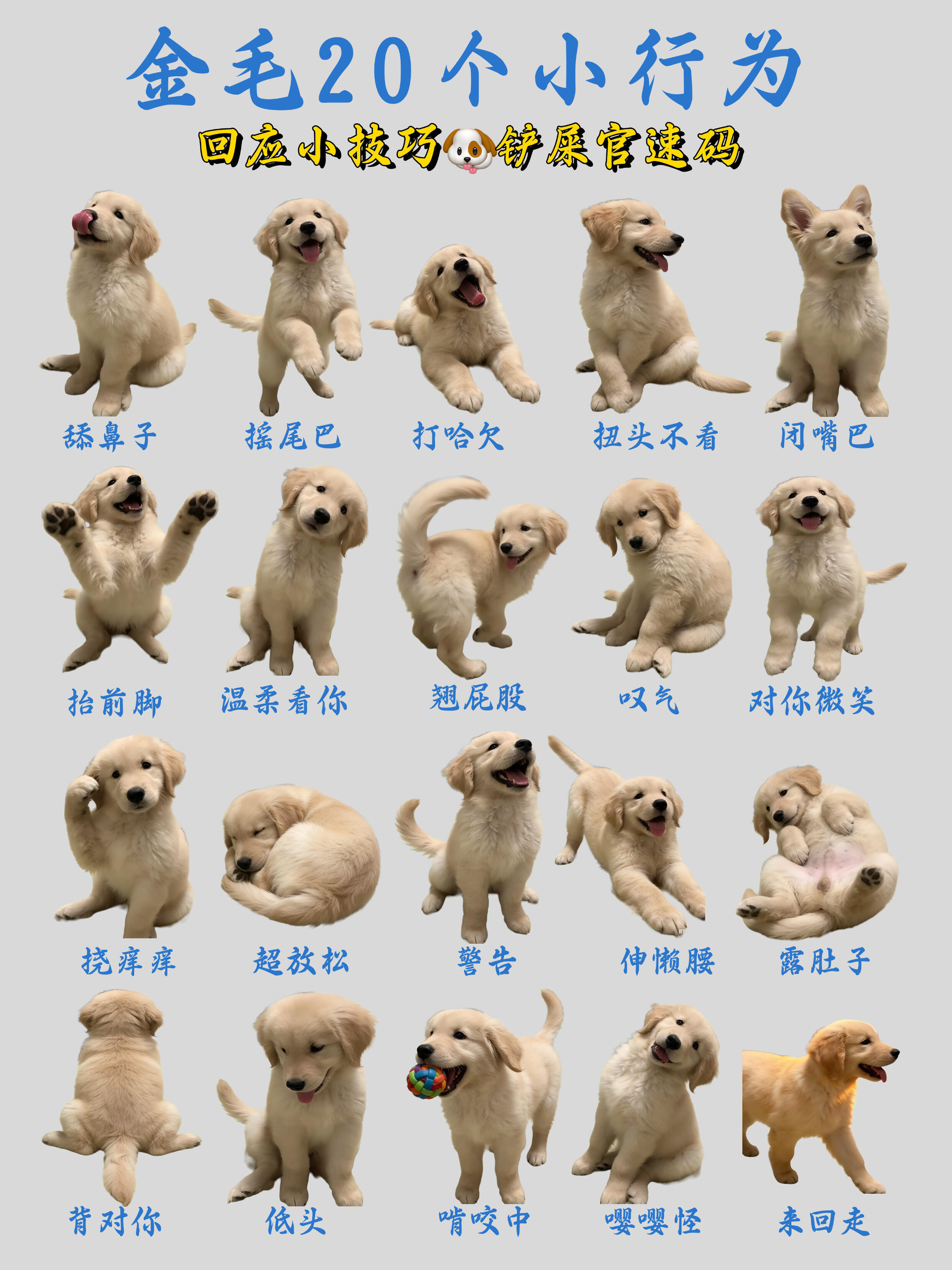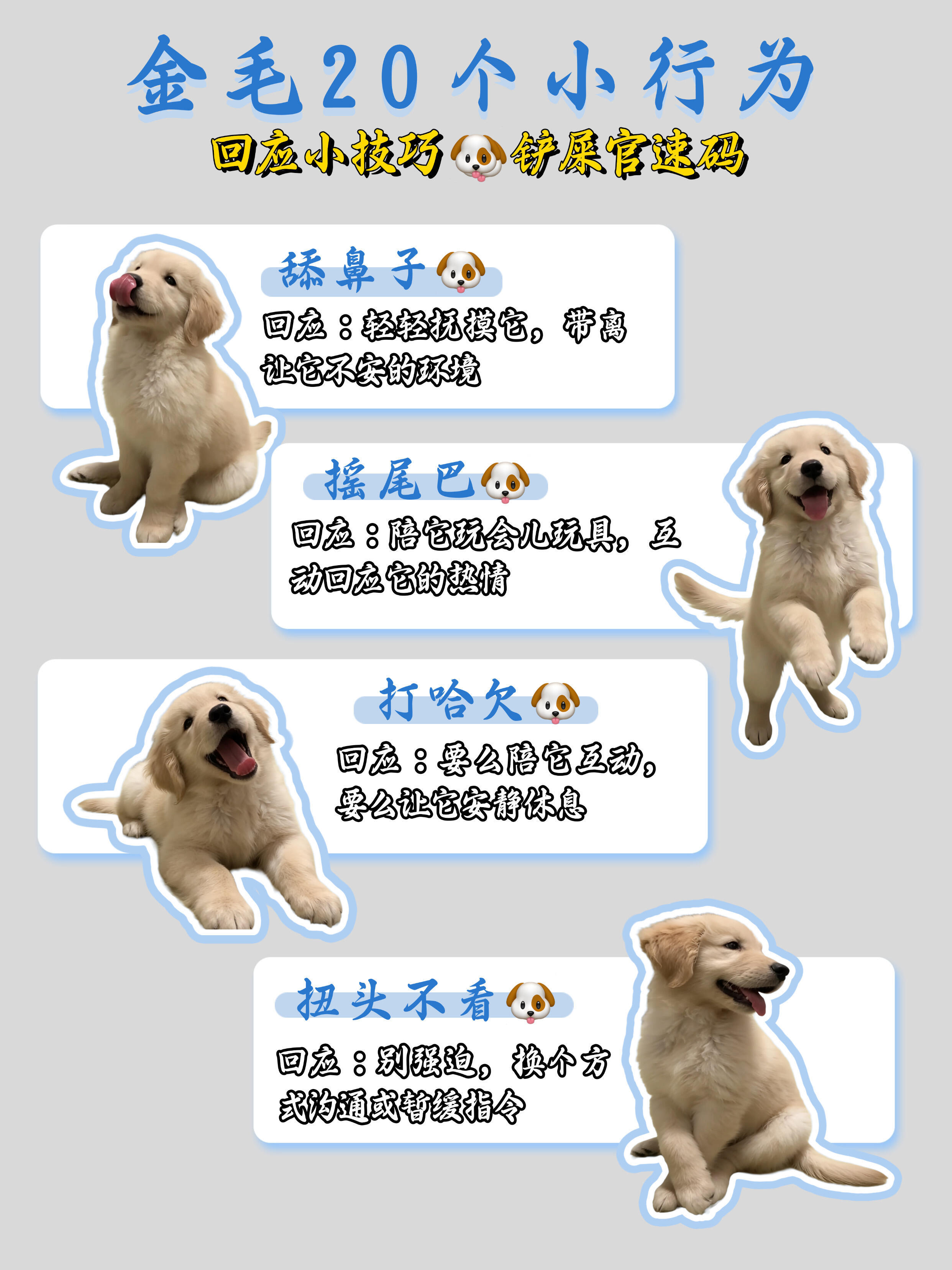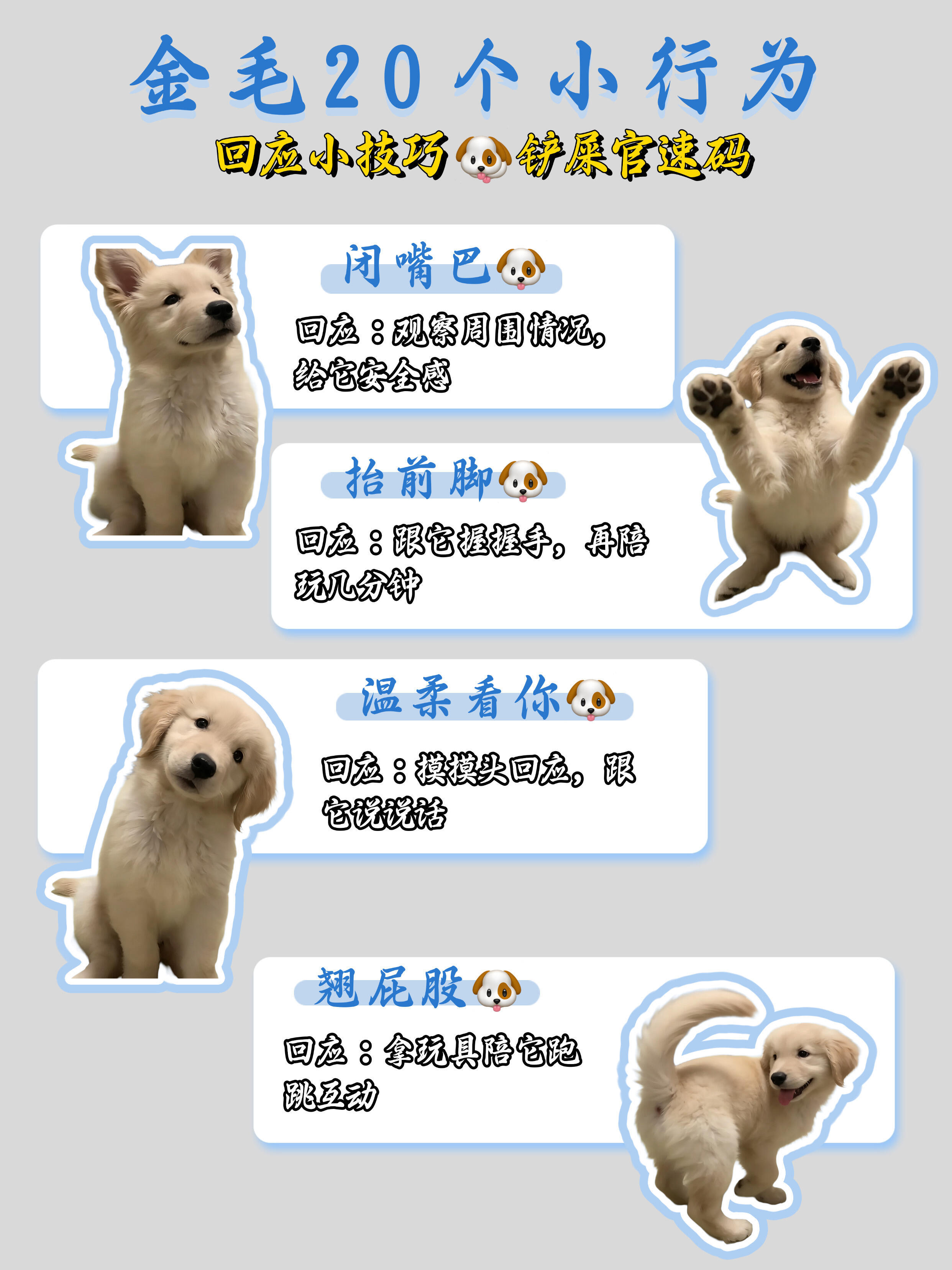 金毛总翘屁股?20种小行为铲屎官怎么回应TA?宝子们,养金毛真的要懂它的小情绪🐶要及时给回应,别伤了毛孩的心是不是总不知道怎么回应修勾的小行为?来速码整理了金毛20个常见行为+回应技巧,简单好懂,新手也能秒会👇