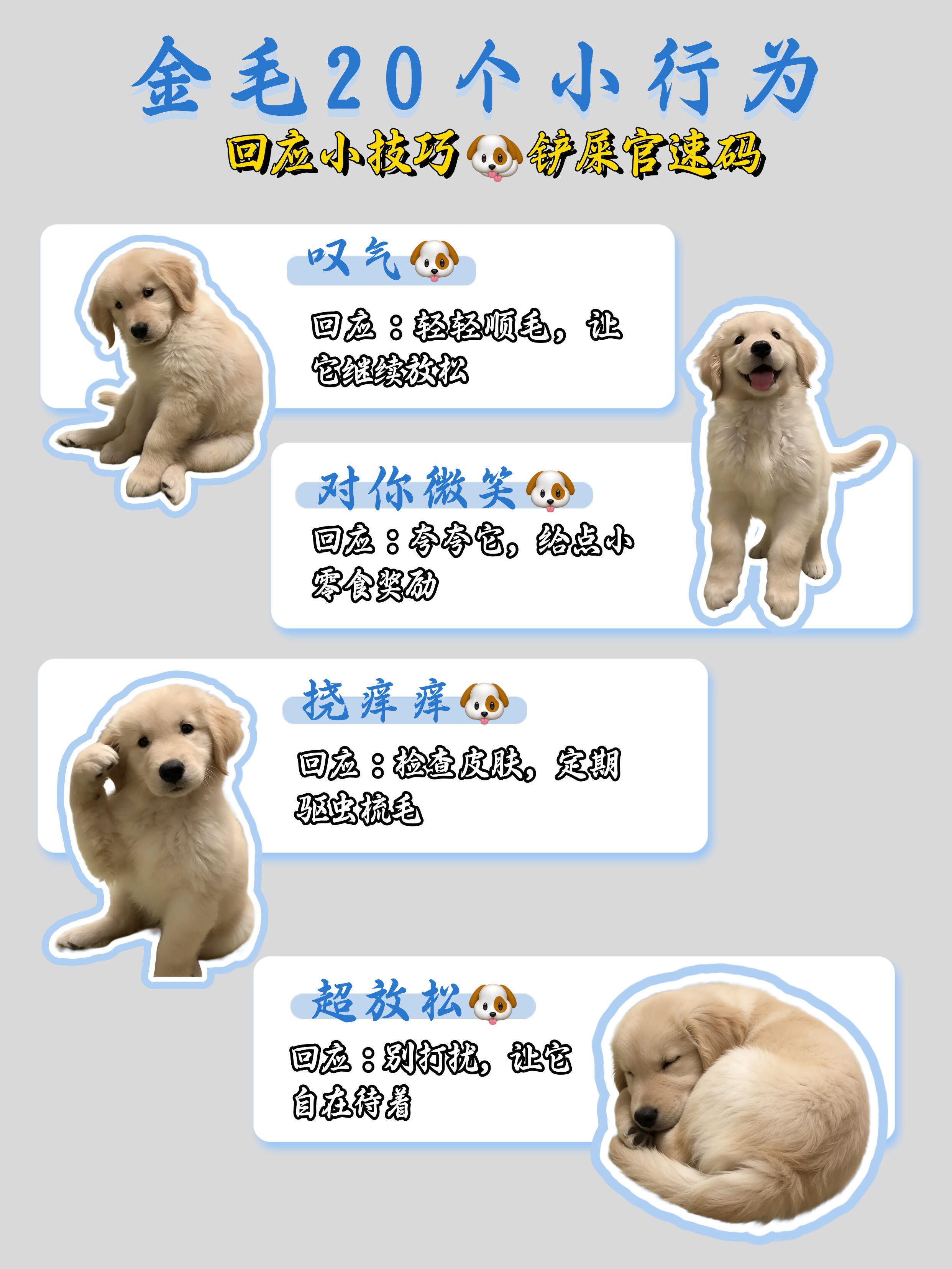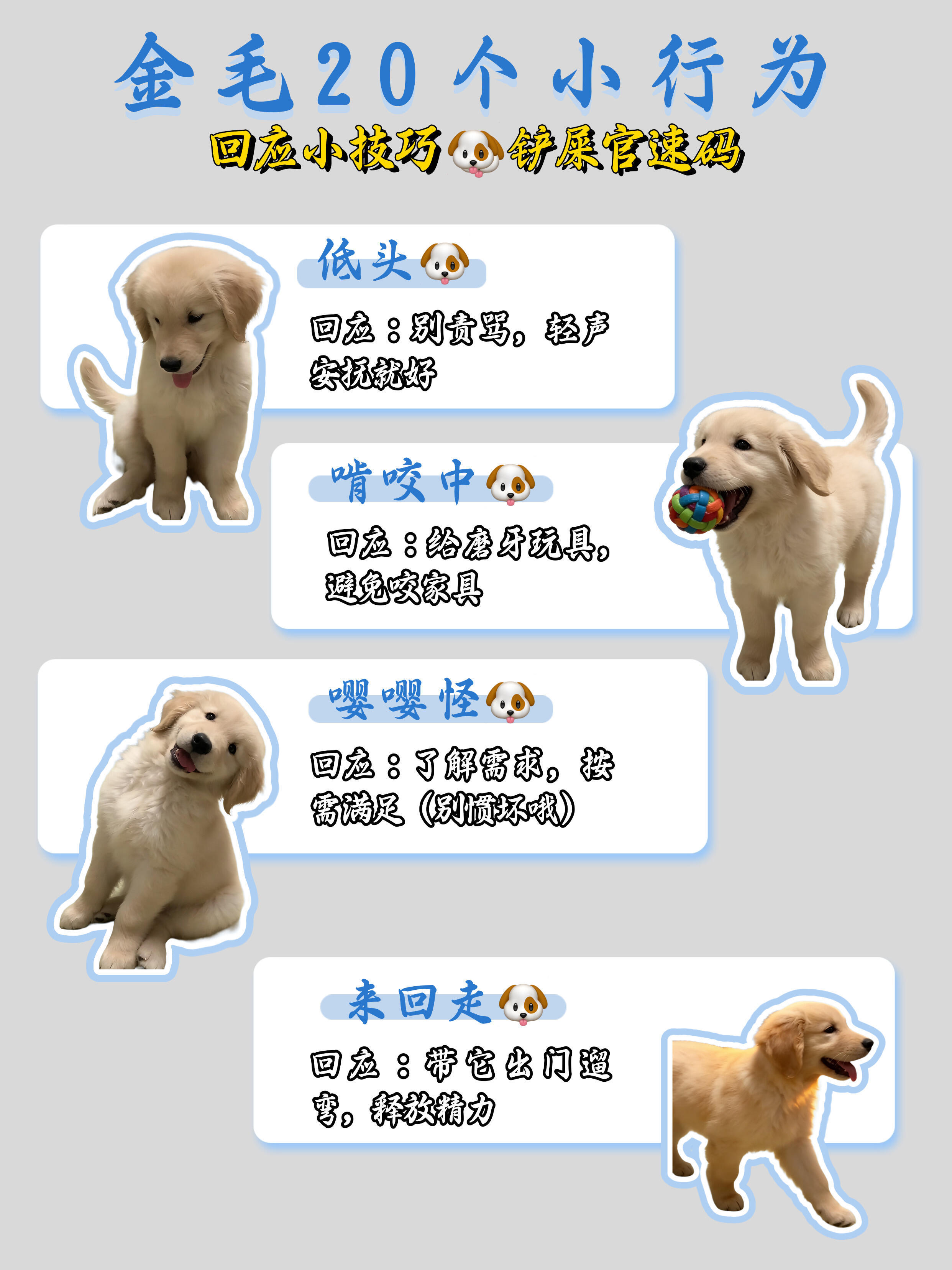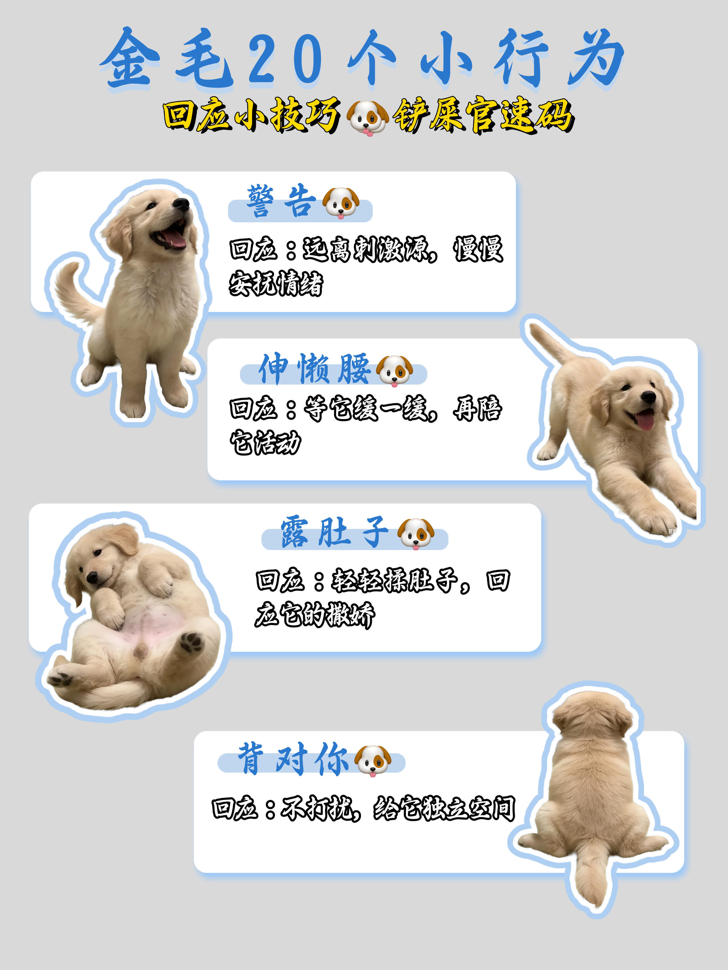 金毛总翘屁股?20种小行为铲屎官怎么回应TA?宝子们,养金毛真的要懂它的小情绪🐶要及时给回应,别伤了毛孩的心是不是总不知道怎么回应修勾的小行为?来速码整理了金毛20个常见行为+回应技巧,简单好懂,新手也能秒会👇
