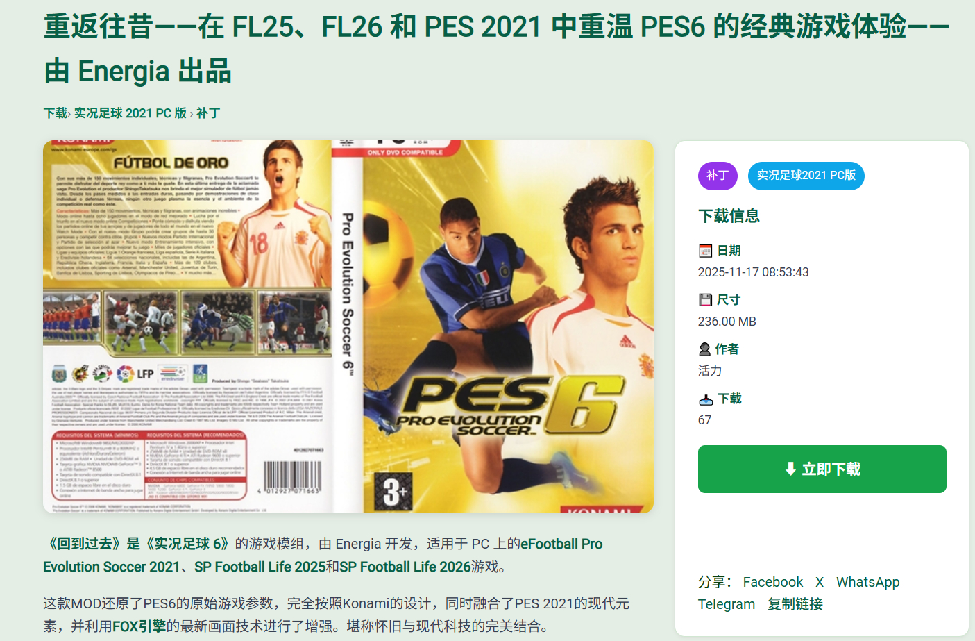 ⚽️ PES6 的魅力又回来了!🎮现在,您可以通过“回到过去”这款终极模组重温经典,该模组将实况足球 6 的经典游戏玩法适配到 PES 2021、足球人生 2025 和 FL26 中!🔧凭借 FOX 引擎的现代图形和 Konami 100% 原创的游戏机制,这是怀旧与现实的完美结合。📥现已开放免费下载。网页链接