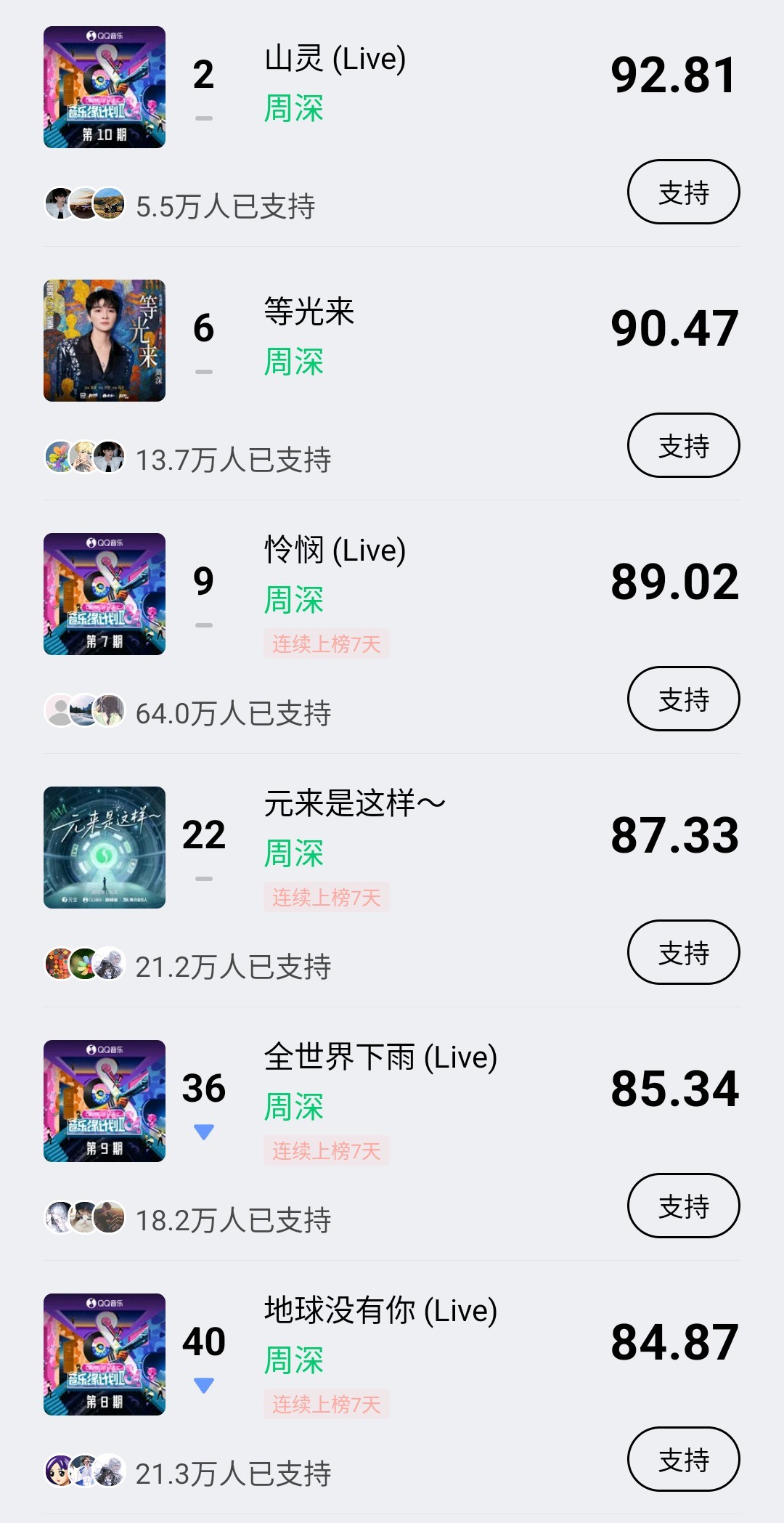 周深 📣 12.27 巅峰潮流 📣米米们傍晚好,每歌做6个动作路径:Q音-乐馆-排行-潮流巅峰📍重点做新歌✅《山灵(live)》✅《等光来》✅《怜悯(live)》📍其他top50✅《元来是这样~》✅《全世界下雨(live)》✅《地球没有你(live)》完成『支持』让更多人听到深深