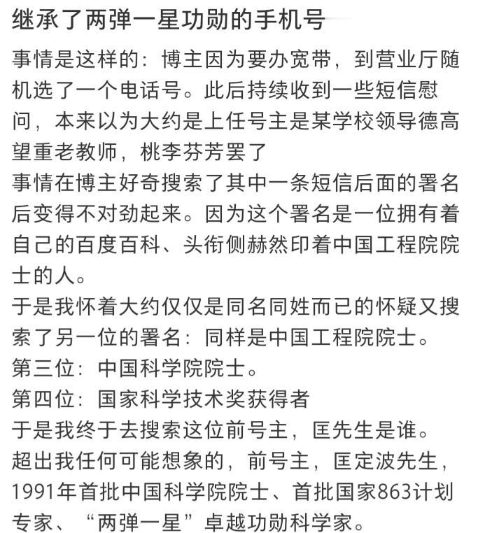 有位网友办理一个新的手机卡,有幸继承了功勋的手机号…… 事情是这样的:一位博主因为要办宽带,到营业厅随机选了一个电话号。此后持续收到一些短信慰问,于是他去搜索这位前号主,结果超出他任何可能想象的,前号主竟然是匡定波先生,1991年首批中国科学院院士、首批国家863计划专家、“两弹一星”卓越功勋科学家。 说白了,随机选个手机号都能和功勋科学家“隔空结缘”,听着是天选好运,实则藏着老号段绕不开的糟心事,更扯出了电信运营商信息管理的大漏洞。 最近有个网友的经历刷爆了社交平台,说出来谁都得惊叹一句“太魔幻”,他因为办理宽带,去营业厅随便选了个手机号,本以为就是个普通的通讯工具,没成想接下来的日子里,各种带着敬意的慰问短信源源不断地发过来。 一头雾水的他顺着线索去查这个手机号的前主人,结果直接被惊掉了下巴——这位前号主竟然是匡定波先生,1991年首批中国科学院院士、首批国家863计划专家,更是为“两弹一星”事业立下汗马功劳的卓越功勋科学家。 这份意外的“传承”,让网友既激动又忐忑,激动的是能和功勋科学家产生这样奇妙的联结,忐忑的是总觉得占用了不该占用的号码,还得小心翼翼地回复那些慰问信息。 不过这份特殊的经历,也让不少有过老号段使用经历的人炸了锅,纷纷吐槽起自己踩过的坑。 要知道,现在市面上流传的不少老号段靓号,尤其是那些尾号是豹子号、连号的,看着洋气有面儿,实则大概率是“雷区”。 很多都是之前的用户因为欠了债无力偿还,干脆弃号跑路,运营商把号码回收清理后,又重新放出来售卖的。 要是不小心选到这种号,那日子可就热闹了,每天不是催债电话就是催收短信,座机、手机轮番轰炸,拉黑都拉黑不过来,严重影响正常生活。 更让人糟心的是,这背后还藏着严重的信息泄露问题,就像这位继承了功勋科学家手机号的网友,前号主的相关信息能通过手机号被轻易检索到,普通人的信息自然也难以幸免。 有网友就吐槽,自己之前用的老号段,不知道前主人是个什么情况,总有无名女士打电话过来,一开口就问他是谁,还让他喊某个名字接电话,稍有解释就会被劈头盖脸骂一顿。 后来才弄明白,前主人大概率是个欺骗感情的渣男,自己纯属替人背锅,忍了好一阵子实在扛不住,只能花钱换了个新号段的号码,才算彻底摆脱了麻烦。 仔细想想,这种情况根本就是典型的信息泄露,甚至可能涉及安全泄密,手机号作为重要的个人身份关联载体,运营商本该对用户信息进行严格的保密和管理,可现实却是,旧号主的信息能轻易泄露给新号主,催债方也能精准获取号码进行骚扰。 这不禁让人怀疑,运营商在号码回收、重新投放的过程中,是否尽到了信息清理和保密的义务? 这样的漏洞很可能成为安全隐患,有网友就建议,遇到这种情况应该举报到国安部门,严查电信、移动、联通这些运营商,倒逼他们完善信息管理机制。 其实不止老号段靓号,很多普通老号段都可能存在类似问题,毕竟号码的流转过程不透明,谁也不知道上一任用户是什么身份、留下了哪些遗留问题。 与其冒着踩坑的风险追求所谓的“靓号”或老号段情怀,不如选择新号段的号码,虽然可能没那么“有面儿”,但至少能少去很多不必要的麻烦。 文章仅为个人看法,你有没有过使用老号段踩坑的经历?对于运营商号码流转中的信息管理问题,你有什么想说的?欢迎在评论区留言讨论。