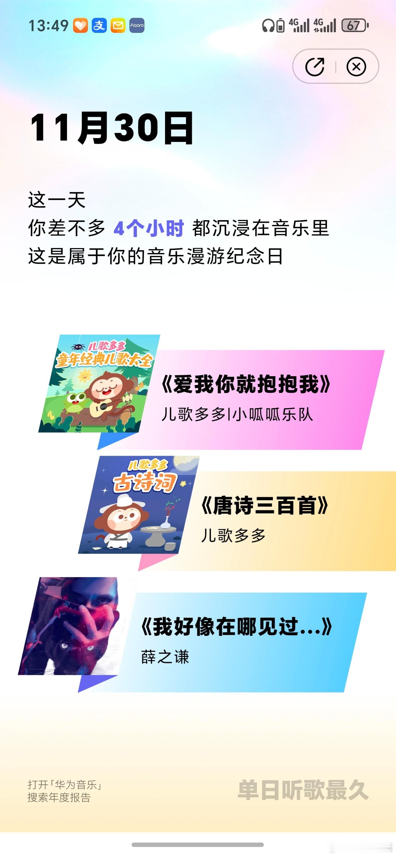 华为音乐这个年度总结真的很走心,有了孩子后,儿歌也成为了生活的一部分,并且还给你显示今年听歌的设备,这个有点仪式感拉满了,并且还能显示你的鸿蒙智行车型和车里里播放最多的歌曲。作为华为音乐一直以来的使用者,我现在真的特别推荐,所有的音乐都有空间音频,很多华为设备买了就送会员,简直就是免费听,推荐大家用起来!