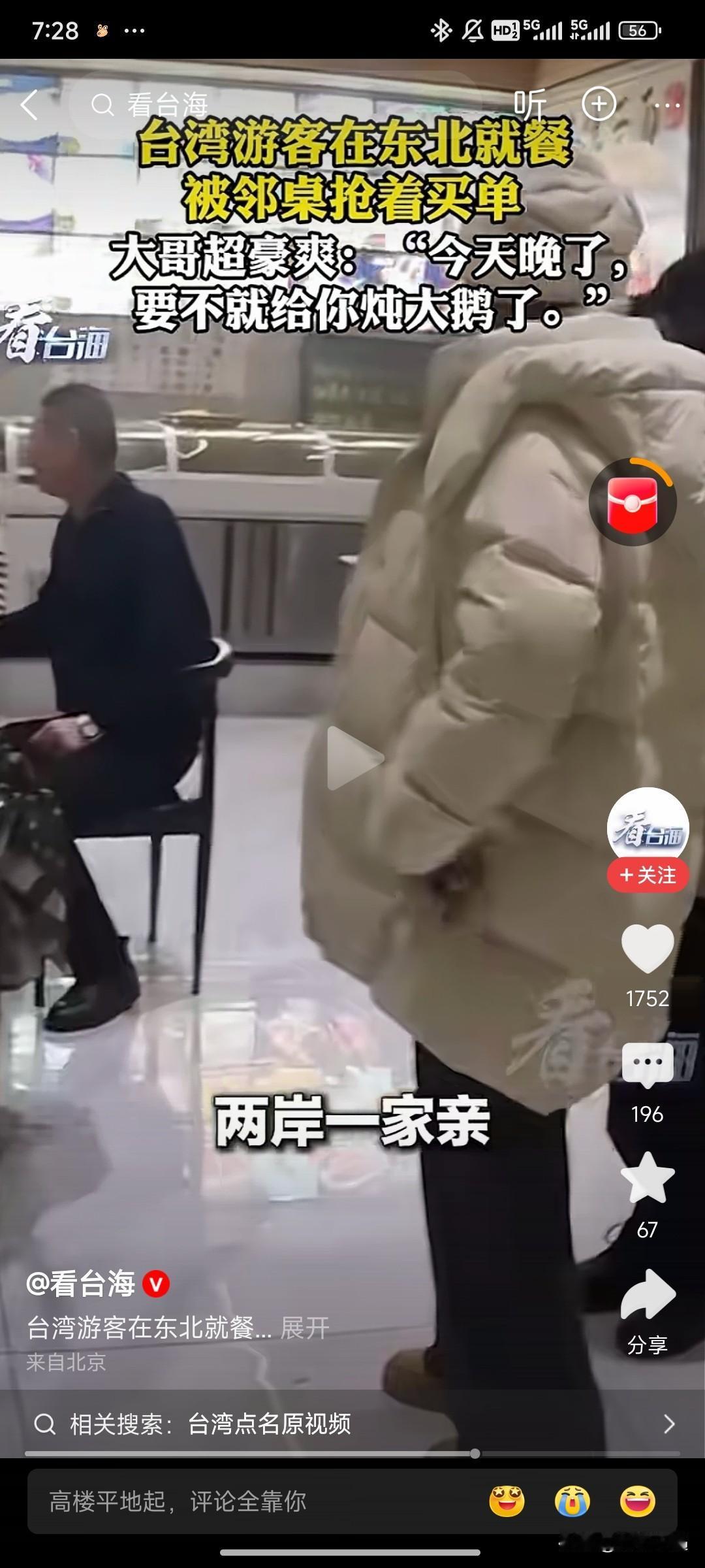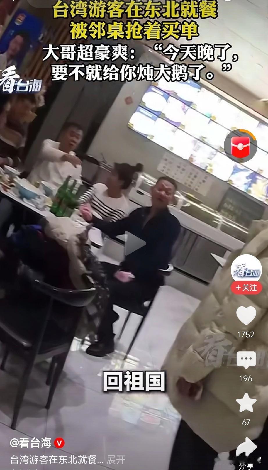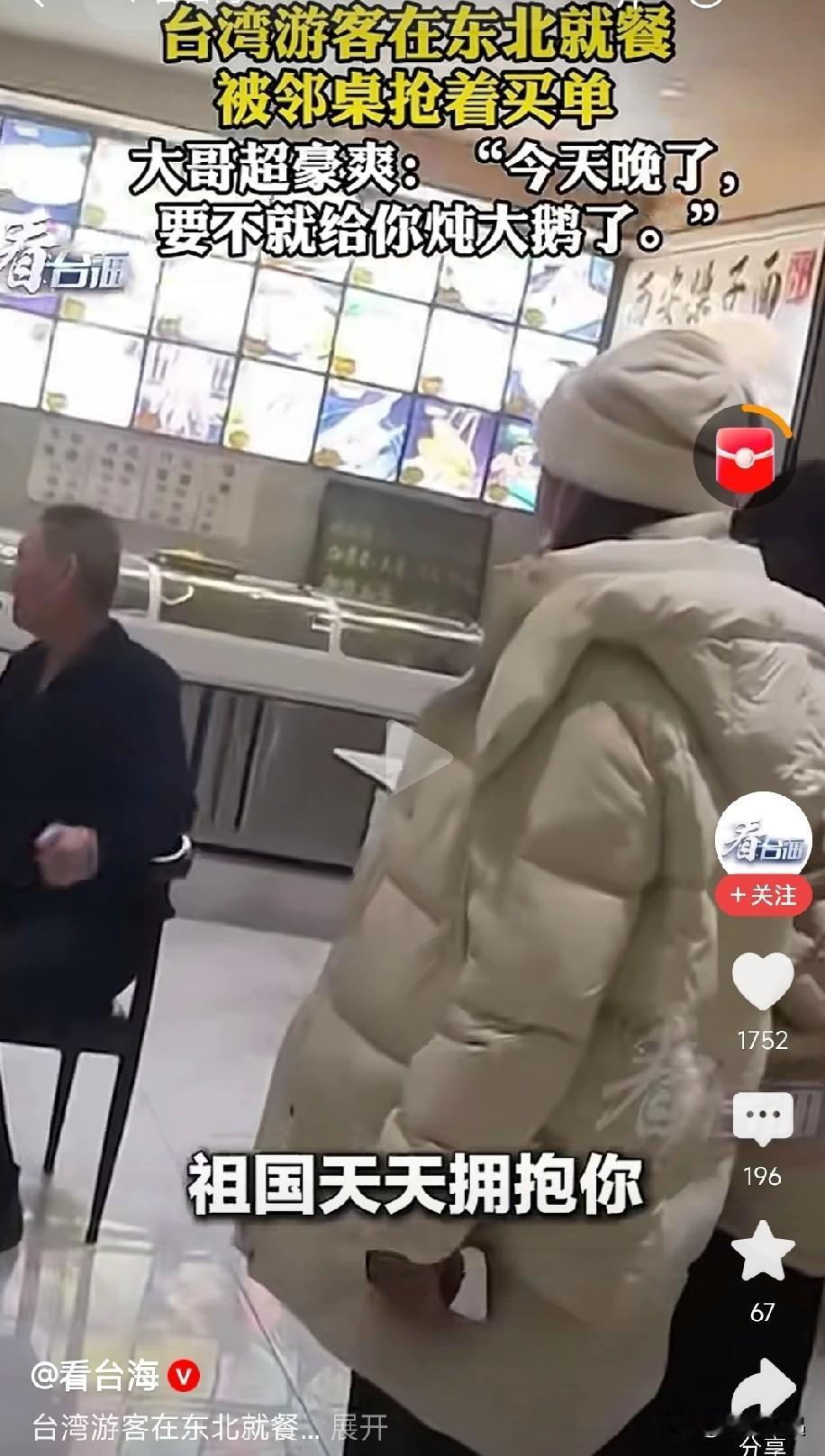 咱就是说,东北人的豪爽真的刻在骨子里!台湾游客在东北饭馆吃饭,刚说自己是从台湾来的,邻桌大哥直接抢着把单买了,还特敞亮地说“今天晚了,要不就给你炖大鹅了”。 一句“两岸一家亲”,不是嘴上说说的客套话,是东北大哥实打实的热情,是刻在骨子里的同胞情。隔着屏幕都能感受到那份热乎劲儿,这才是咱们中国人该有的样子,血脉里的亲近是怎么都挡不住的。 各位读者你们怎么看?欢迎在评论区讨论。