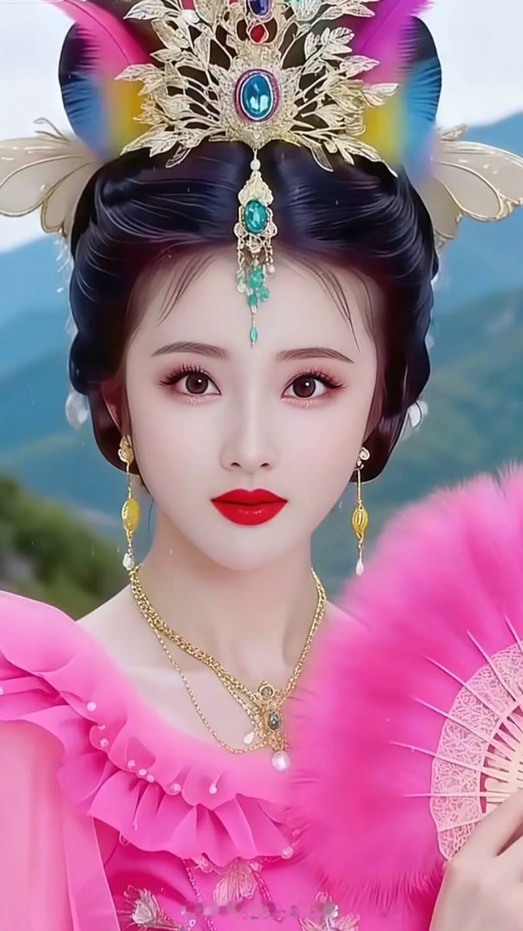 惊艳的古典美人,头戴华丽发饰,手持粉色团扇,尽显优雅气质。