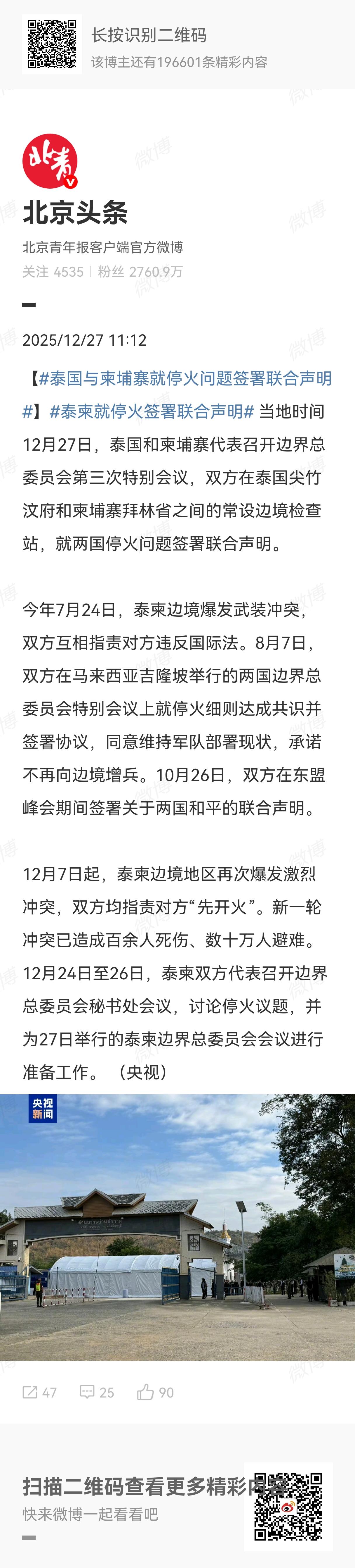 12月13日,老特就宣布泰柬停火了,可是当时直接被阿努廷否认了,然后过了两周两国终于签订了停火协议。这一次应该是真正停火,至少三四年之内不会再战。但老特肯定又会说都是他的功劳,他的“诺贝尔和平奖”功勋簿上又多了一项记录,可以大写特写。2025年泰柬冲突,老特两次成功调停斡旋实现停火。老特血赚!