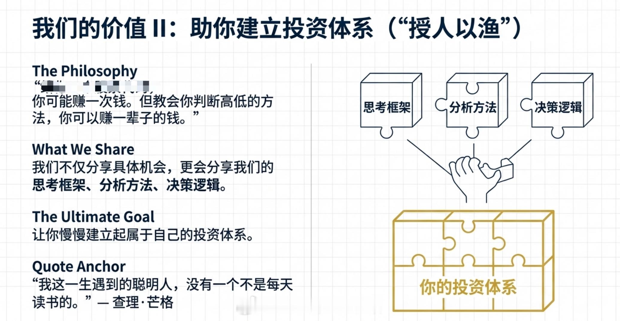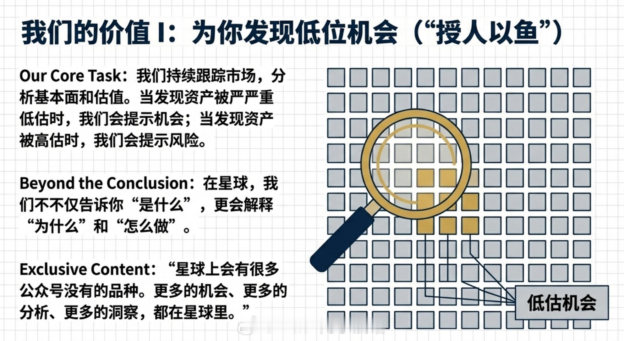 财富自由到底靠什么?很多人问我:财富自由到底靠什么?有人说靠努力,有人说靠运气,还有人说靠关系。这些都对,但都不是本质。巴菲特的合伙人查理·芒格说过一句话:"想要得到某样东西,最好的办法就是让自己配得上它。"大白话就是:你想要财富自由,首先得让自己具备财富自由的能力。什么能力?占有生产资料的能力,而不是被生产资料占有。打工是用时间换钱,时间卖完了,钱也就到头了。但如果你拥有一家公司的股份、一套收租的房子、一个能持续产生现金流的资产,那才是真正的生产资料。这个星球,就是在教大家:如何以更低的成本,去占有生产资料。一、为什么大多数人在A股亏钱?我先问你一个问题:你觉得价值投资在A股有用吗?很多人会说:没用,价值投资就是个笑话。我理解这种情绪。因为太多人打着"价值投资"的旗号亏了钱,然后就骂价值投资是骗人的。但你仔细想想,他们真的在做价值投资吗?不是的。他们只是在价值投机。什么意思?就是他们听说茅台是好公司,然后在2600块的时候冲进去,结果被套了。套了之后不甘心割肉,于是安慰自己说:"没事,我是价值投资,长期持有就行。"等了两年,股价还在跌,他就开始骂:价值投资没用!但问题是,这根本不是价值投资,这是追高被套,被迫躺平。巴菲特说过一句非常重要的话:"以合理的价格买入一家优秀的公司,远比以便宜的价格买入一家平庸的公司要好得多。"注意,他说的是"合理的价格",不是"任何价格"。茅台是好公司吗?是的。但2600块的茅台是好投资吗?不一定。很多人亏钱的根本原因,不是选错了公司,而是买得太高了。就像你去菜市场买菜,白菜很好吃,但如果有人卖你100块钱一斤,你买不买?肯定不买,因为太贵了。但到了股市里,很多人就忘了这个道理。他们只看公司好不好,不看价格贵不贵。这就是为什么大多数人在A股亏钱的真正原因。二、什么是真正的价值投资?那什么才是真正的价值投资呢?很简单:在低位买入,在高位卖出。你可能会说:这不是废话吗?谁不想低买高卖?问题是,大多数人做的恰恰相反——高买低卖。为什么会这样?因为人性。当股价一直涨的时候,你会觉得它还会继续涨,于是你追进去了。当股价一直跌的时候,你会觉得它还会继续跌,于是你割肉了。结果就是:永远在高点买入,在低点卖出。巴菲特说:"别人贪婪时我恐惧,别人恐惧时我贪婪。"这句话人人都会背,但真正能做到的人少之又少。为什么?因为做到这一点需要两样东西:第一,你得知道什么是"高",什么是"低"。很多人根本分不清高低。他们只是凭感觉,觉得涨了就是高,跌了就是低。但这种感觉往往是错的。真正的高低,要看估值,看基本面,看行业周期,看宏观环境。这需要专业的分析能力。第二,你得有独立思考的能力,不被市场情绪左右。当所有人都在恐慌抛售的时候,你敢不敢逆势买入?当所有人都在疯狂追涨的时候,你敢不敢冷静卖出?这需要强大的心理素质,更需要对投资的深刻理解。三、我们能帮你做什么?说了这么多,回到正题:这个星球能帮你做什么?第一件事:帮你发现低位的机会。这是我们最核心的价值。我们会持续跟踪市场,分析各个行业、各个公司的基本面和估值水平。当我们发现某个资产被严重低估的时候,我们会提示机会;当我们发现某个资产被严重高估的时候,我们会提示风险。在公众号上,我们一般只会说一个结果。但是在星球上,我们会告诉你:是什么?为什么?怎么做?不仅告诉你结论,还告诉你得出结论的过程。因为只有理解了过程,你才能真正学会独立判断。而且星球上会有很多公众号没有的品种。毕竟公众号一天只能发一篇文章,但星球可以发很多篇。更多的机会、更多的分析、更多的洞察,都在星球里。第二件事:帮你建立自己的投资体系。这一点可能比第一件事更重要。芒格有一句名言:"我这一生遇到的聪明人,没有一个不是每天读书的。"投资不是赌博,不是靠运气。投资是一门学问,需要系统地学习和积累。我们希望做到的是:授人以鱼,不如授人以渔。只说看到了什么机会,你可能赚一次钱。但教会你判断高低的方法,你可以赚一辈子的钱。所以在星球里,我们不仅会分享我们看到的机会,更会分享我们的思考框架、分析方法、决策逻辑。让你慢慢建立起属于自己的投资体系。有了这个体系,你不仅能在A股里游刃有余,在人生的其他选择中,你也能做出更好的决策。四、投资思维对人生的意义为什么我说投资体系对人生也有用?因为你的人生本身就是一场投资。小到今天吃什么、周末去哪玩,大到和谁结婚、去哪买房、进入哪个行业、加入哪家公司——你的每一个选择,本质上都是一次投资行为。你在用你的时间、精力、金钱,去换取某种回报。如果你能用投资的思维去看待人生,你会发现很多事情变得清晰了:选择行业,就像选择赛道。要选那些长期向上、天花板高的行业。选择公司,就像选择标的。要选那些管理优秀、文化健康的公司。选择伴侣,就像选择合伙人。要选那些价值观一致、能够共同成长的人。而最重要的是:不要在错误的事情上坚持太久。很多人在一段糟糕的关系里死耗,在一个没有前途的行业里死磕,在一只不断下跌的股票里死扛。他们觉得这是"坚持",是"长期主义"。但真正的长期主义,不是无脑坚持,而是在正确的事情上坚持。如果方向错了,越坚持亏得越多。这时候最