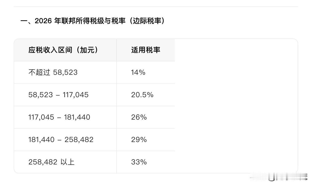 万税之国加拿大,2026年联邦所得税级公布 加拿大税务局(CRA)本周发布了经通胀指数化调整后的新版联邦税级,2026 年联邦所得税级标准税率维持不变,但各级别对应的收入门槛均有上调。