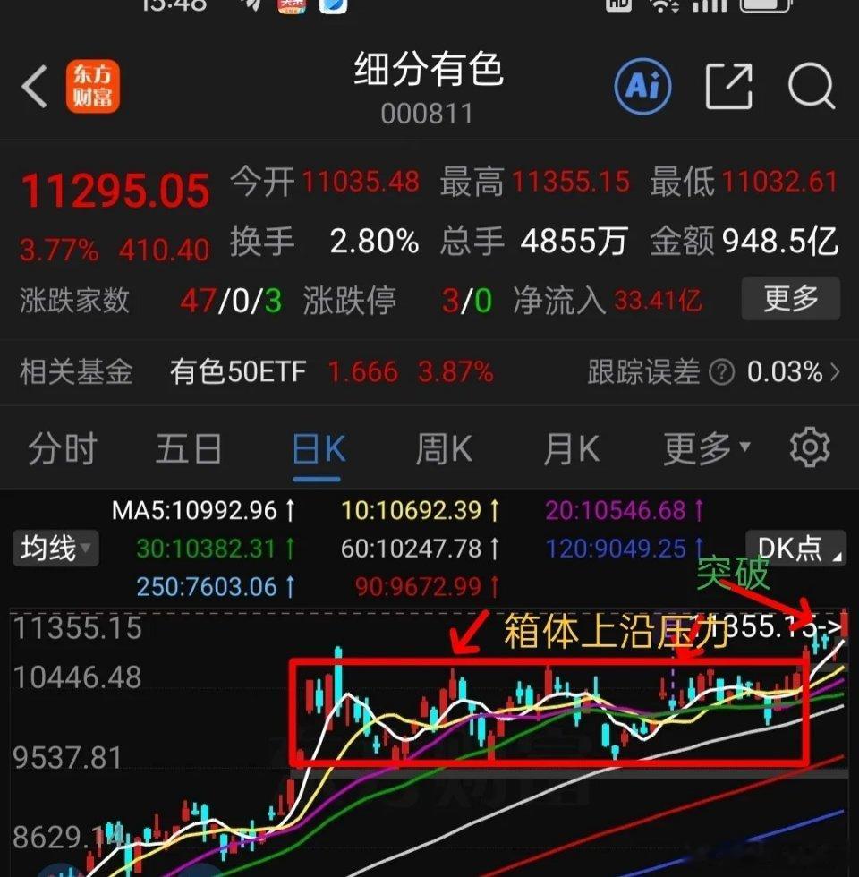 周末聊基金:下周走势分析,有色金属将开启主升浪模式。 下图是细分有色金属日线走势图,前期经过2个多月的箱体震荡(图二所示),周一跳空高开一举突破箱体上沿,本周周五再次跳空高开,彻底摆脱横盘区域,目前所有均线都是向上运行,周线月线趋势向上。 布林线开口向上,macd低位金叉,接下来将加速上涨,周五期货黄金及白银再次大涨创新高,估计下周初还是高开高走,短期不可能有大跌出现。操作观点,持仓待涨,回调加仓,激进派也可以适当追高介入。 以上观点仅供参考不构成投资依据,点赞转发关注投资理财不迷路。