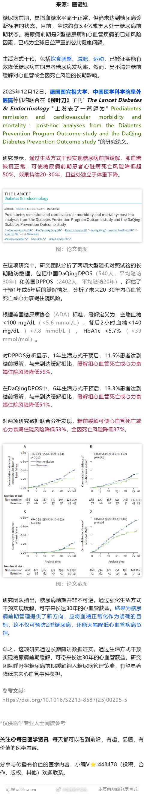 健闻登顶计划 柳叶刀子刊:糖前患者控血糖,心脏病死亡风险降低超50%,且保护效果长达30年2025年12月12日,德国图宾根大学、中国医学科学院阜外医院等机构联合在《柳叶刀》子刊" The Lancet Diabetes & Endocrinology "上发表了一篇题为" Prediabetes remission and cardiovascular morbidity and mortality:post-hoc analyses from the Diabetes Prevention Program Outcome study and the DaQing Diabetes Prevention Outcome study "的研究论文。研究显示,通过生活方式干预实现糖尿病前期缓解,即血糖恢复正常,可使糖尿病前期患者心脏病死亡风险降低超50%,效果持续20-30年,且益处独立于体重下降。