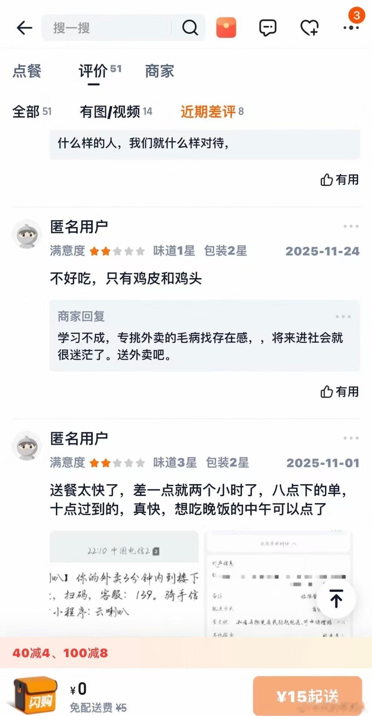 这人咋每次评论区说人家出来工作是送外卖的,翻过来复过去地讲这几句话,靠贬低别人找优越感,比差评本身更掉价,做生意先学做人,连尊重都不懂,难怪留不住客!大盘鸡店嘲讽差评学生学历低大盘鸡店嘲讽差评学生学历低
