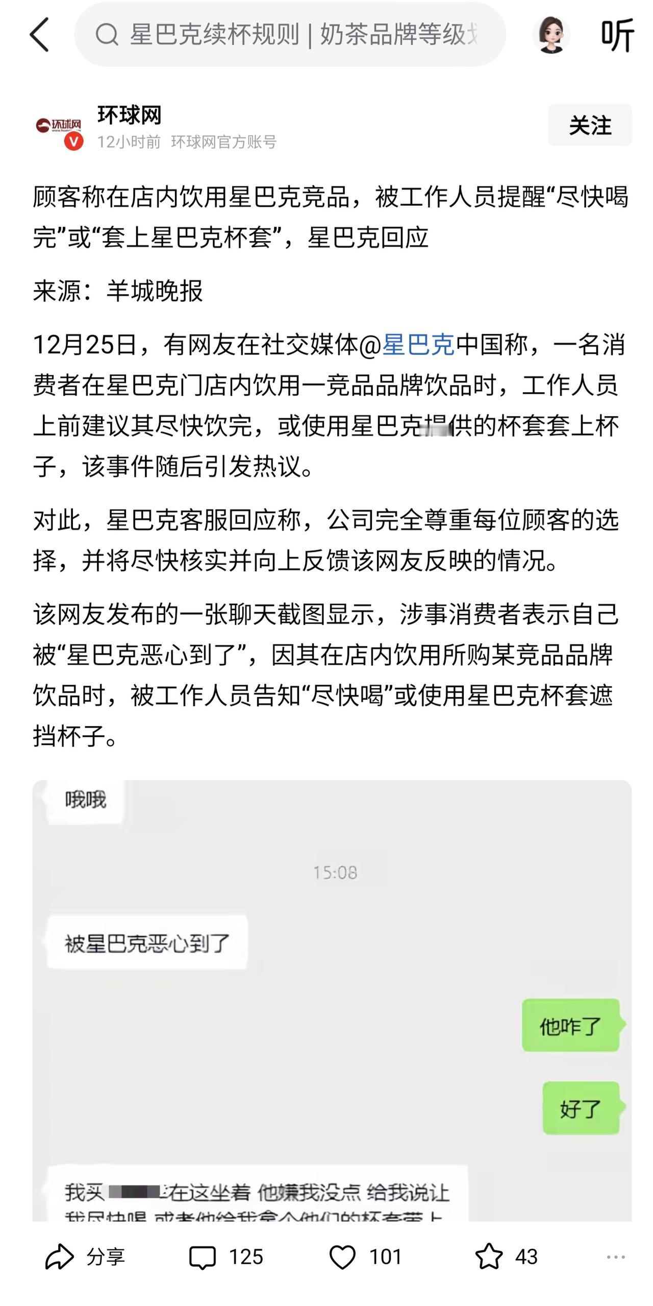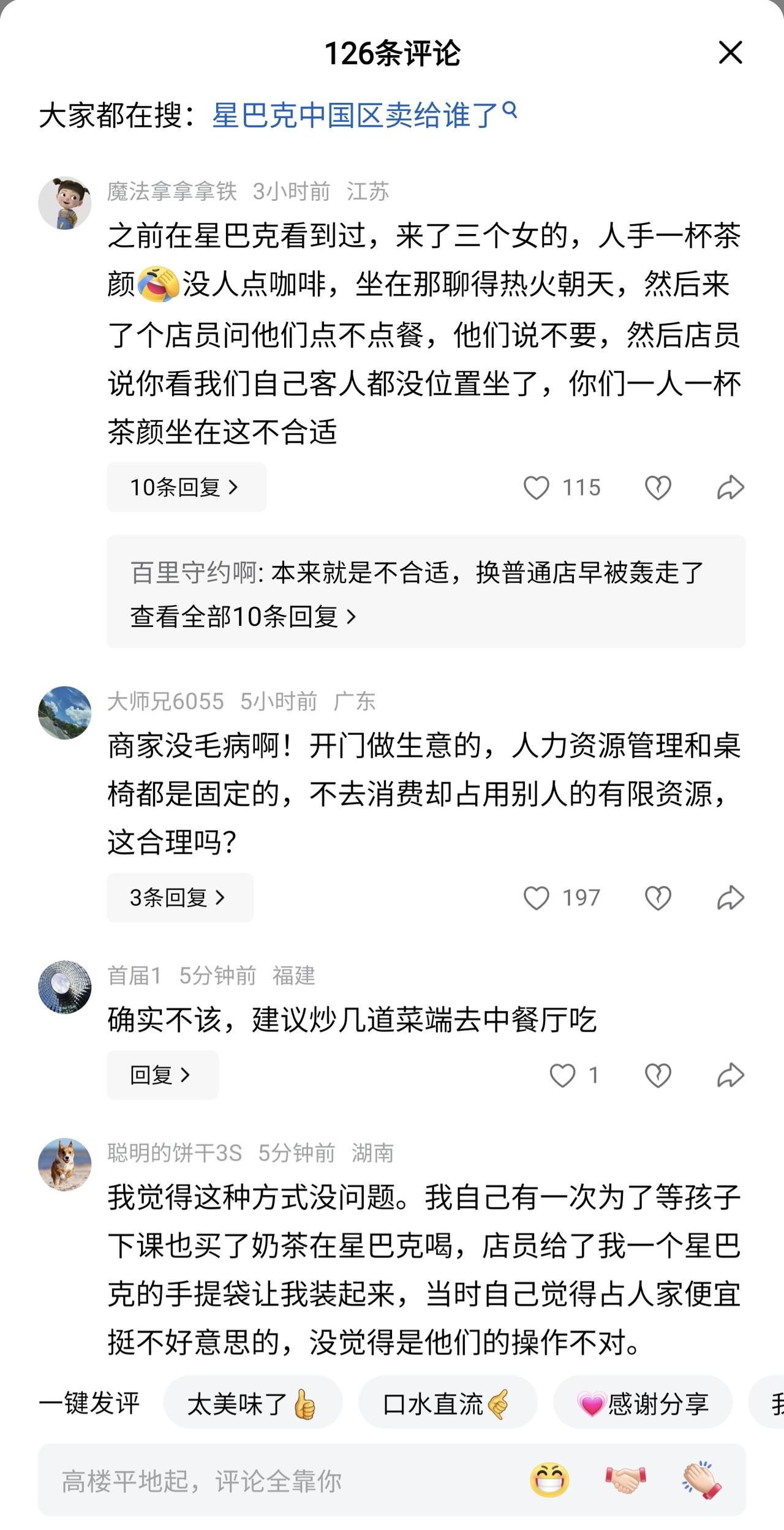 星巴克的“提醒”错了吗?消费者该反思的是自己! 看到网友评论,感觉到自己的三观还是很正的。 近日,有网友发帖称在星巴克店内饮用其他品牌饮品,被工作人员提醒“尽快喝完”或套上星巴克杯套,怒批被“恶心到了”。但这一次,我站星巴克。 我觉得星巴克作为提供消费环境与服务的商业场所,未强制驱离未消费的顾客,仅以“杯套遮挡”或“尽快饮用”作为委婉提醒,已是最大程度的包容。这并非“驱逐”,而是对品牌形象与店内秩序的基本维护。 反观该消费者,不仅携带竞品入内,更将此事公开“挂”上网,试图以“受害者”身份引导舆论。这何尝不是对商业场所基本礼仪的漠视?你在肯德基点麦当劳、在影院自带别家爆米花,还要求对方笑脸相迎,这真的是合理的“消费者权利”吗? 商业场所并非公共公园,品牌有权维护自身的空间氛围。消费者若真想“自由饮用”,大可选择公园、广场等真正的公共空间。既想享受星巴克的环境与座位,又想公然展示竞品,甚至反手曝光企业——这不是维权,这是任性。 尊重是相互的。星巴克给了你座位,你至少该给品牌一份体面。 星巴克 消费者