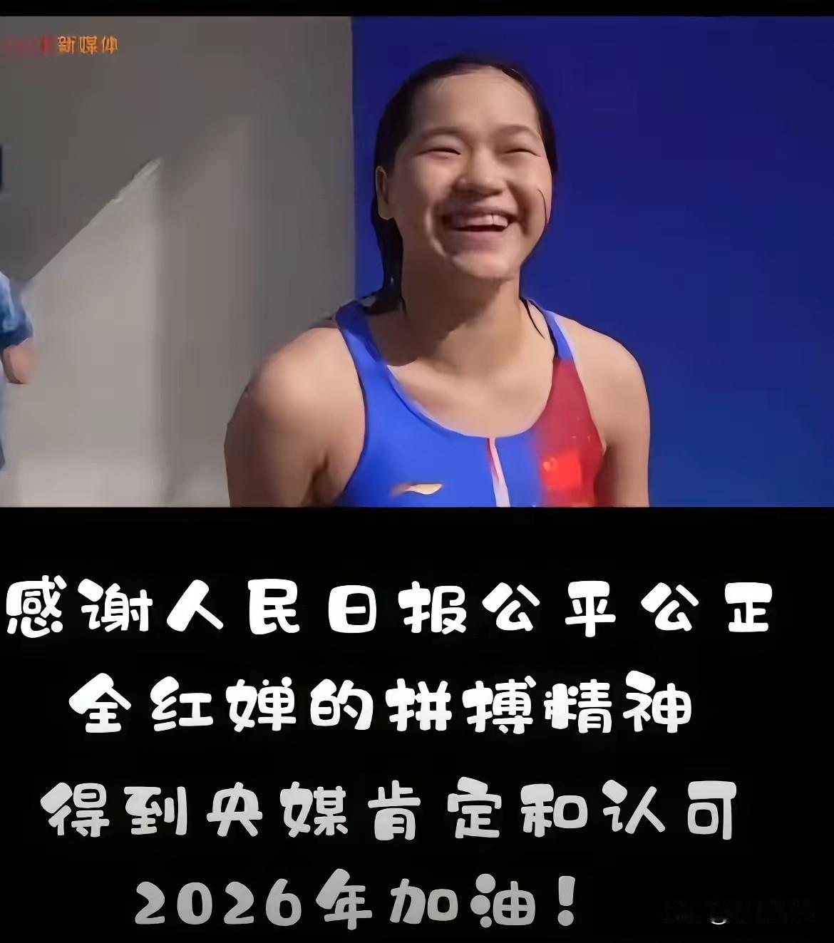 人民日报为全红婵喝彩 12月25日人民日报《为自己喝彩》发文里,只有全红婵出现了2次,并且全红婵都是笑容灿烂。 这两次亮相,不是简单的文字重复,更不是偶然的编辑偏爱,是主流媒体对这个跳水少女最直白的肯定,最暖心的点赞 这个17岁的姑娘,早就在赛场上把实力刻进了观众心里。2025赛季她拿下11个国际赛事冠军,满分跳水动作上演了8次。 跳水台十米高的距离,她一蹦就是十几年。从湛江的小泳池到世界赛场,淤青爬满手掌,汗水浸透泳衣,从来没喊过一声苦。 大家爱她,不只是爱她的冠军头衔。更爱她赛场上的拼劲,赛后采访时的耿直,还有面对镜头时那抹不加修饰的笑容。 主流媒体的偏爱从来不是凭空来的。她的成长轨迹,就是普通人靠努力逆袭的鲜活范本,戳中了无数人心里的那份共情。 有人说她是天赋型选手,可没人看到她背后的付出。每天陆上训练3小时,水上训练5小时,重复成百上千次的起跳和入水。 全红婵的名字反复出现,是对拼搏者的致敬。这告诉每一个追梦人,只要肯咬牙坚持,平凡也能熬出万丈光芒。 那些质疑她“昙花一现”的声音,早就被她的成绩单砸得粉碎。她用一个又一个冠军,证明自己不是偶然,而是必然。 她的笑容里藏着的,是少年人的赤诚和底气。这份底气,是日复一日的汗水浇出来的,是站在最高领奖台练出来的。 各位读者你们怎么看?欢迎在评论区讨论。全红婵 全红婵勇夺冠 全红婵传奇人生