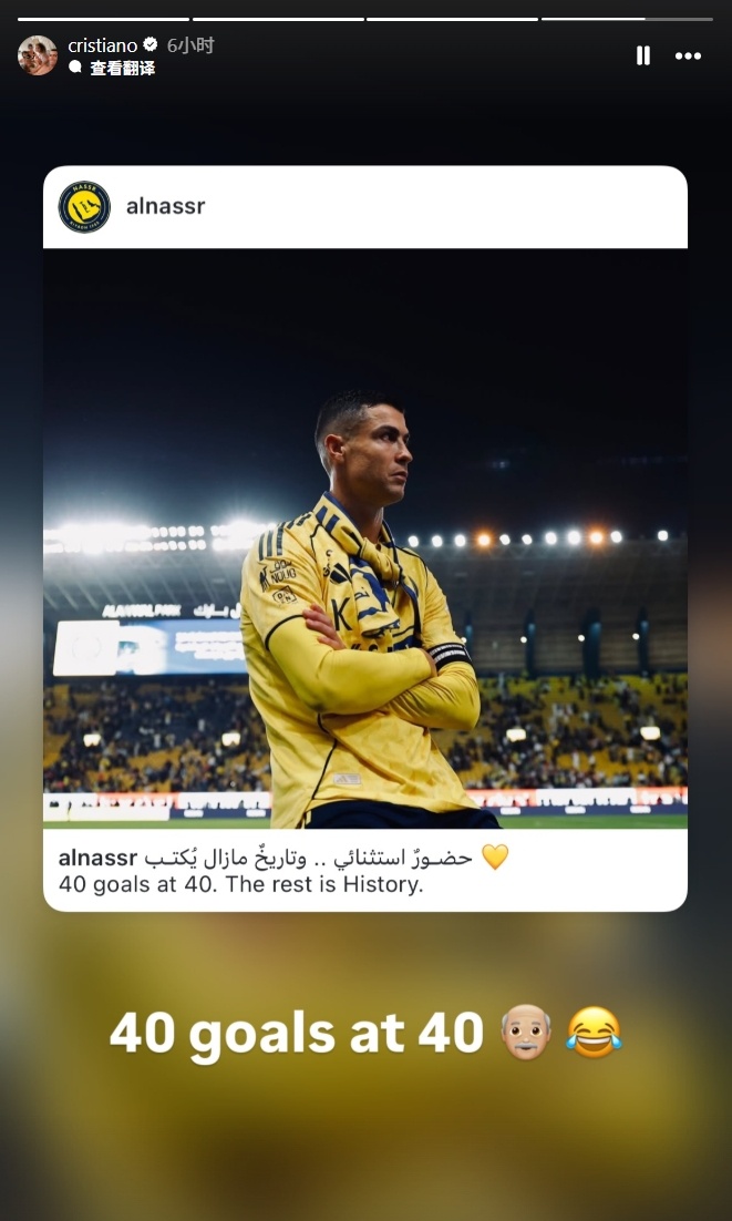 #C罗40岁攻入40球#沙特联第11轮,利雅得胜利3-0击败阿科多,C罗梅开二度斩获生涯第956球,将个人2025年的进球数扩大至40球。利雅得胜利官方社媒发帖致敬C罗,并写道:“40岁攻入40球,剩下的就是历史了。”C罗在个人社媒转发了这条帖子并开启自我调侃,他配上了“40岁攻入40球”的文字,附上了一个老爷爷和笑哭的表情包。#C罗梅开二度#