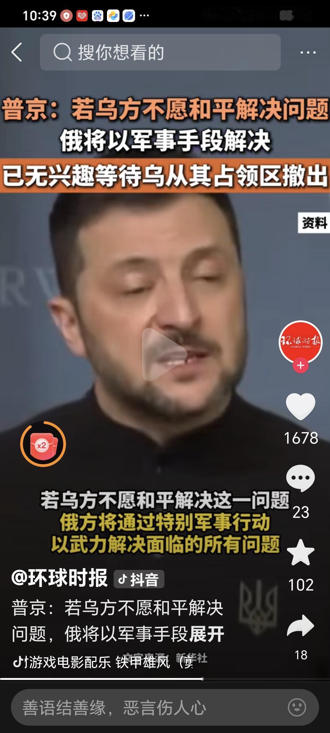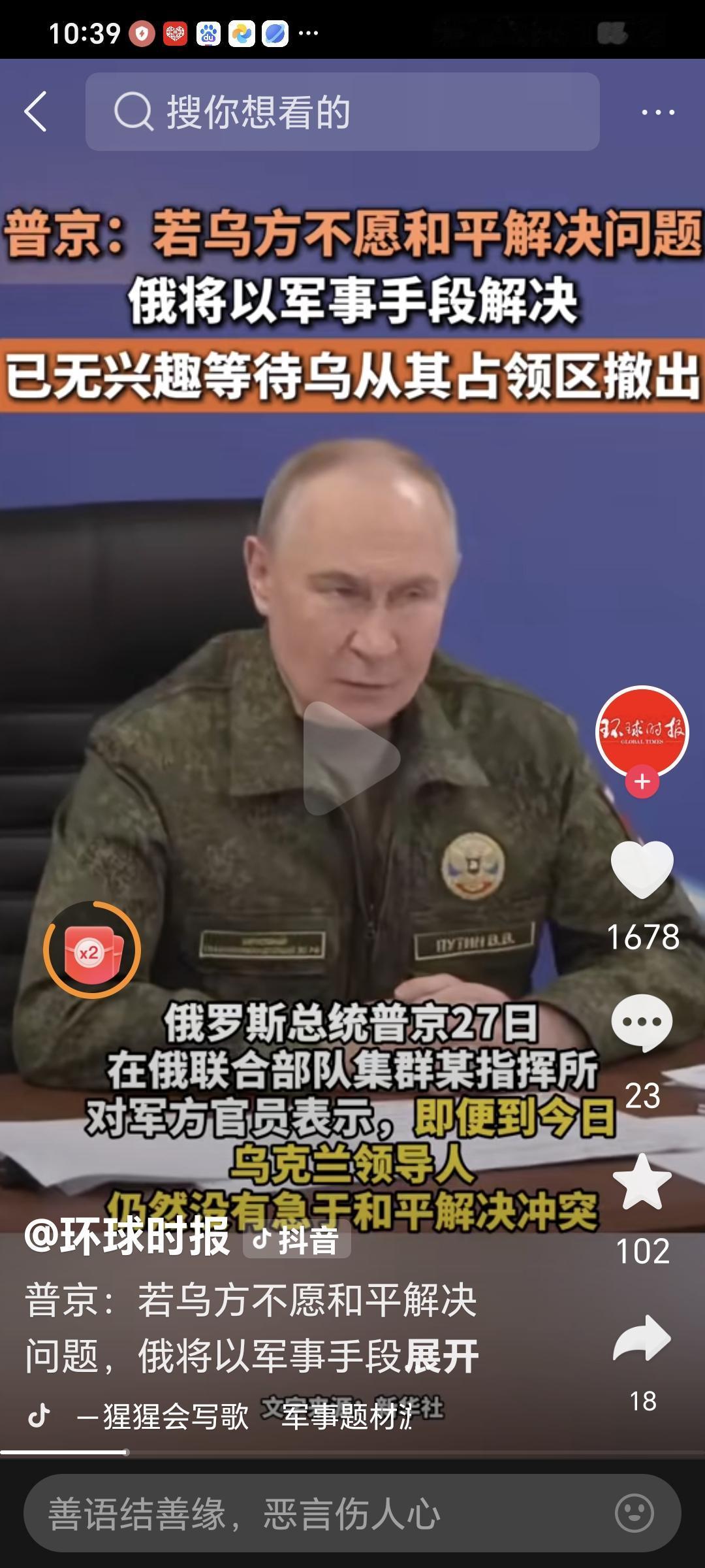 普京军装发言:若乌方不愿和平解决冲突,俄方将以武力解决所有问题 俄罗斯总统普京12月27日在俄联合部队集群某指挥所与军方官员会晤时表示,即便到今日,乌克兰领导人仍然没有急于和平解决冲突。若乌方不愿和平解决这一问题,俄方将通过特别军事行动以武力解决面临的所有问题。 网友,乌克兰不明白啊,战场上拿不到的,谈判桌上更不可能……俄罗斯从来都是相信武力的,所以乌克兰面前只有两条路:割地投降;顽抗到底;咎由自取。战场主要就在乌克兰,打残的主要也是乌克兰城市,死的多数也是乌克兰人,看视频,甚至很多白发苍苍的老人,也被抓壮丁送到了前线…… 可怜乌东河边骨,犹是春闺梦里人。 和平从来不是战争的必然终点,更多时候只是两场风暴间脆弱的间隙。当土地被铭刻上新的分界线,当仇恨被植入下一代人的记忆,今天的“结束”,或许只是明日更复杂博弈的序章。 我们呼唤和平,因为它弥足珍贵;我们怀疑和平,因为它往往只是力量的休整。 真正的终结,从来不在于一纸协议,而在于人心深处,那关于尊严、生存与共处的答案,是否已被真正寻得。这,很难!