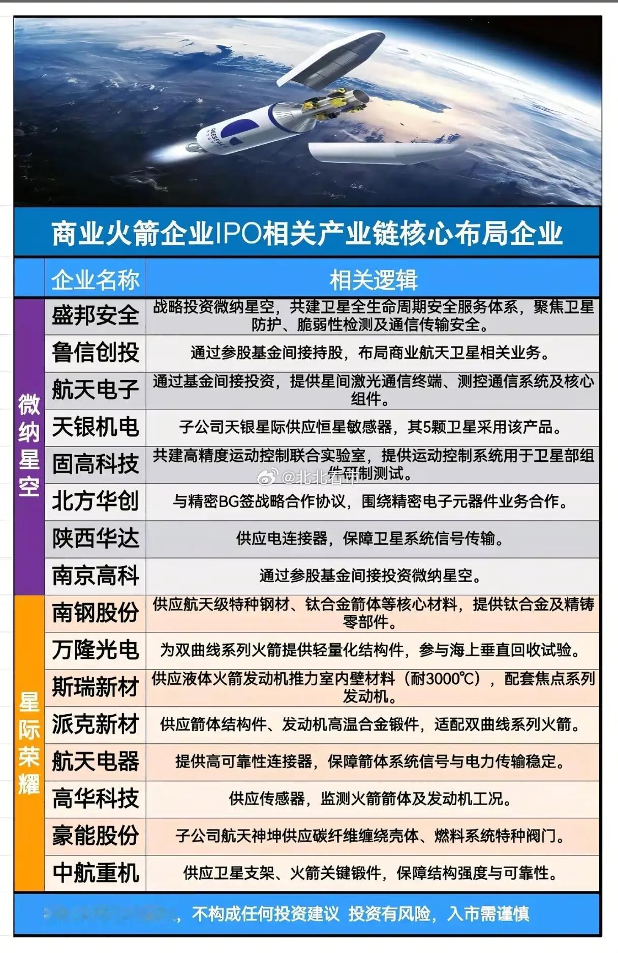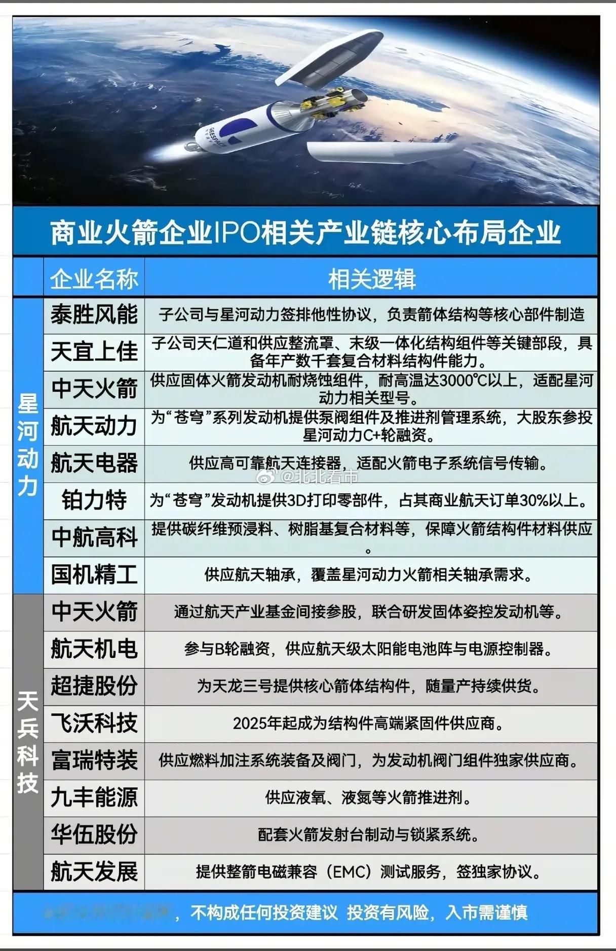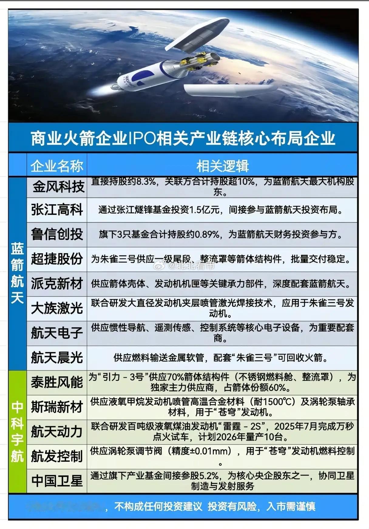 商业火箭IPO潮来袭,哪些产业链企业能站上航天风口?商业航天的黄金时代已至,商业火箭企业IPO的消息搅动市场,究竟哪些产业链企业能借势分享航天红利?这份核心布局清单,揭开了商业火箭背后的“硬核玩家”图谱,也让航天产业的投资逻辑愈发清晰。蓝箭航天作为商业火箭赛道的主力军,其产业链布局覆盖了从资本到制造的全环节。金风科技以超10%的持股成为最大机构股东,张江高科、鲁信创投通过基金参与投资;制造端更是群星荟萃,超捷股份、派克新材供应箭体核心结构件,大族激光联合研发焊接技术,航天电子、航天晨光则分别提供导航控制系统与燃料输送部件,形成了完整的配套体系。中科宇航、微纳星空、星际荣耀等企业的产业链同样亮点十足。泰胜风能为中科宇航“引力-3号”供应60%的箭体结构件,斯瑞新材的高温合金材料适配多款火箭发动机;微纳星空则撬动了盛邦安全、天银机电等企业,在卫星安全、传感器领域形成配套;星际荣耀的供应链中,南钢股份的特种钢材、派克新材的高温合金锻件,成为火箭制造的关键支撑。星河动力、天兵科技的产业链布局更凸显技术深度。中天火箭的耐烧蚀组件能承受3000℃高温,铂力特的3D打印零部件占其商业航天订单30%;天兵科技的供应链里,富瑞特装独家供应燃料加注系统,九丰能源提供液氧、液氮推进剂,航天发展更是拿下整箭电磁兼容测试的独家协议。这些企业的深度布局,不仅是商业火箭技术落地的保障,更折射出商业航天产业的成熟度。从上游材料、核心部件,到中游制造、测试服务,再到下游资本布局,商业航天的产业链条已实现全环节覆盖。随着商业火箭IPO进程推进,这些配套企业将迎来业绩与估值的双重修复,而航天产业的投资机会,也正从“概念炒作”转向“业绩兑现”的新阶段。