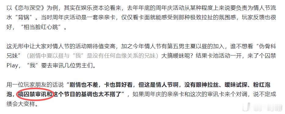其实从游戏产业来看,燕云十六声这波危机,还将一个矛盾彻底摆上了桌面。那就是乙游的路,大众向游戏能不能走。之前恋与深空等乙游流水大涨的时候,很多媒体做过相关报道,研究为什么乙游能够有如此高的盈利有的人归结于出色的游戏架构,有的人认为是精美的角色立绘,还有的人认为是女性友好的氛围。但事实是,所有人都回避了一个最根本的事实乙游拥有一般向游戏想都不敢想的尺度以下是乙游游戏画面这是第一个我觉得不打码都不一定能放出来的画面。相比之下,之前原神申鹤,还有这次的燕云十六声,一个短裙被喷上几千条,又是物化女性又是媚宅,最后一看就这。更夸张的差距在于剧情,大众向游戏这边,男女角色牵个手就要被出警媚宅,而乙游这边,你看资本论他们的采访,很多女玩家认为,不搞眼神拉丝、暧昧试探、搞囚禁审讯,那都不好意思叫情人节活动。这尺度在大众向这边属于想都无法想的程度。所以并不是乙游制作是另一个 Level,而是乙游的色色尺度是另一个 Level,甚至可以说高了好几个层级。搞色色是互联网底层需求之一,你能这么搞色色,盈利能力当然强本质上,这不是一个游戏产业问题,而是一个大众舆论的话语权问题。女性玩家的需求被视为进步主义一环,享受包容进步的赞誉。你把乙游做的再色,尺度再大,舆论也会认为,这是合理的,是应该包容甚至要赞扬的,穿的少不叫低俗,那叫进步开放,21世纪了不是大清,要睁眼看世界!但大众向,男性向游戏,使用的却是另一套价值观,一套保守主义价值观,牵手是不允许的,暧昧是要回避的,甚至出个超短裙都会引发一群人惊诧。其保守程度远超大清大明,连程朱理学都叹为观止。这次燕云十六声的风波,本质就在这里,燕云十六声一直以来以女性友好,女玩家多而著称,所以他认为,自己作为一个类乙游产品,那么开放标准也应该按接近乙游的来算。这次的短裙,从开放尺度来说,其实也就达到了乙游四分之一水平,理论上也确实不应该引发争议但事实是,女玩家对此的敏感程度远超预期。大众向游戏,哪怕女玩家较多,也是有大量男玩家的,那就绝对不能按女性标准,享受开放包容的红利。乙游穿的少叫开放包容,大众向穿的少就是十恶不赦。这个界线并不是你引进女玩家,拉升女玩家比例就能逾越的。这意味着之前游戏行业对于乙游的分析,可能从根基上就错了,乙游的任何情况,任何数据,各种需求报告,各种采访报道,对于大众向游戏都没有一丁点参考性。她这么做能上畅销榜,但你照着做很可能直接被举报。未来游戏行业的各种分析报告,很可能要把乙游单独列出去,因为她没有参考性。