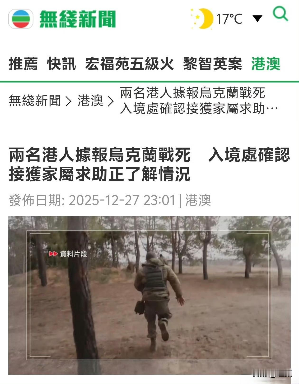 据TVB报道,两名分别为23岁和30岁的香港男子于上月抵达乌克兰,在参与当地战事期间遇袭身亡。事件发生后,遇难者家属已向香港政府寻求协助。 香港入境事务处证实接获相关求助,随即启动跨部门协作机制,透过外交部驻港公署及中国驻乌克兰大使馆核实事件细节,包括遇难者身份信息等关键内容。 据悉,香港公民赴乌可享受14天免签政策,但需满足持有有效护照、购买含军事冲突风险的健康保险等入境要求。而根据中国法律属人原则,中国公民参与境外军事冲突可能涉及相关法律责任,需承担相应后果 。此前俄方曾披露,已有逾3500名外国雇佣兵参与乌军作战,且此类人员不被视为战斗人员,无权获得战俘地位 。