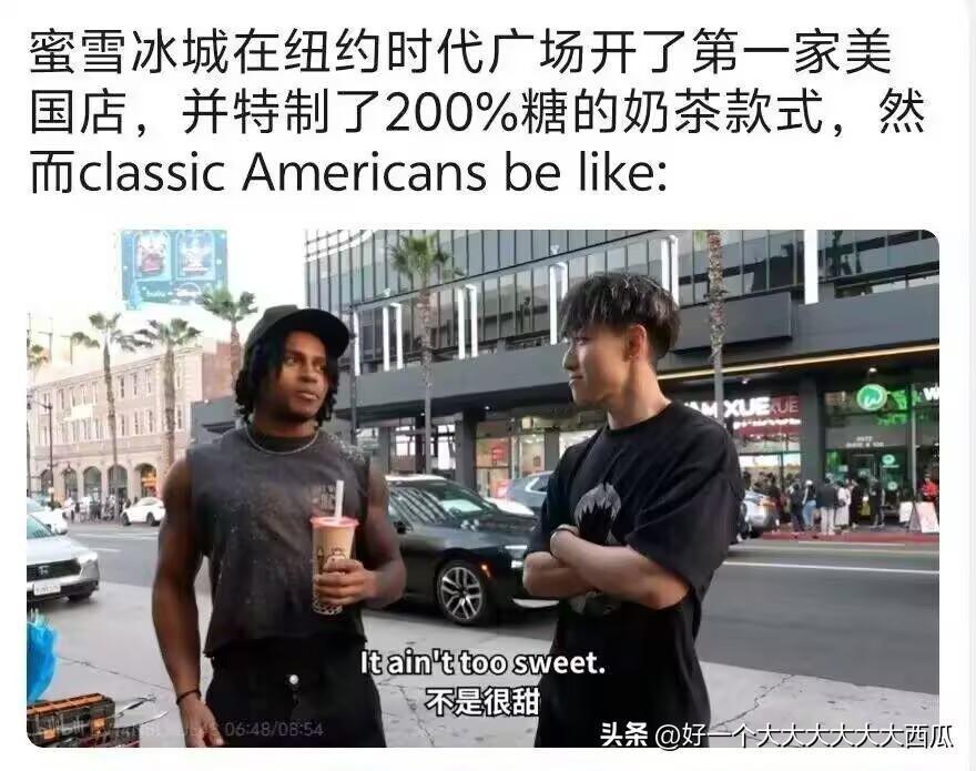 平时点蜜雪冰城30%的糖都觉得还是挺甜了, 可是在美国纽约开的第一家蜜雪冰城可以做200%的糖, 但是美国人由于平时的食物很多都是不顾一切的在放糖, 所以他们在面对蜜雪冰城200%糖度的时候居然会觉得也就那么回事。 难怪美国的牙医收入那么高呢, 天天这样吃糖不知道牙齿被腐蚀成啥样了, 还有各种内脏器官估计都不堪重负。