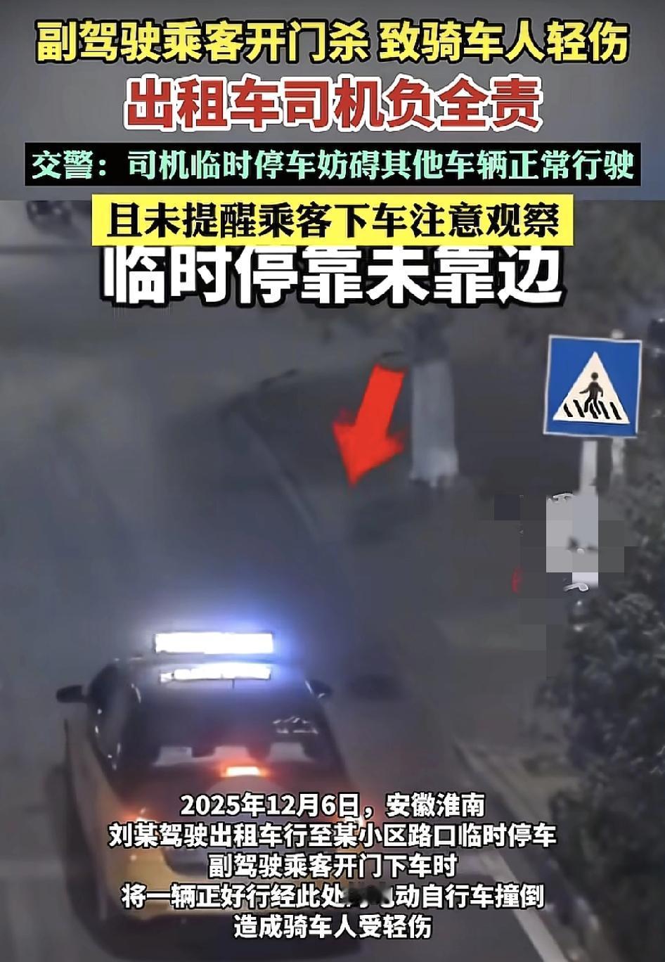 安徽淮北一辆出租车在路边停车,副驾驶下车时未观察后面车辆,致使后边的电动车车主摔倒,受到轻伤。出租车司机被判全责,也有网友说经历过这样的事故,司机与副驾驶的责任分别为70%和30%。不管是谁的责任,下车都需要观察后方,确认没有行人和车辆再下车,而且出租车司机没有靠边再停车,让乘客下车。