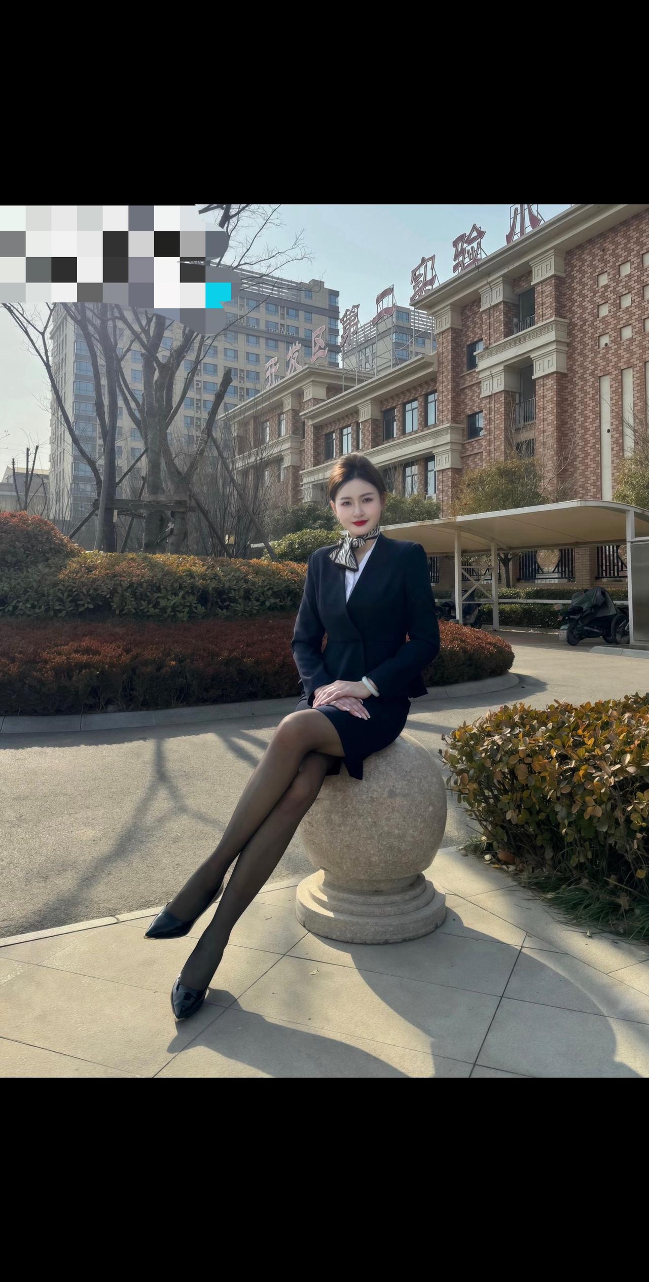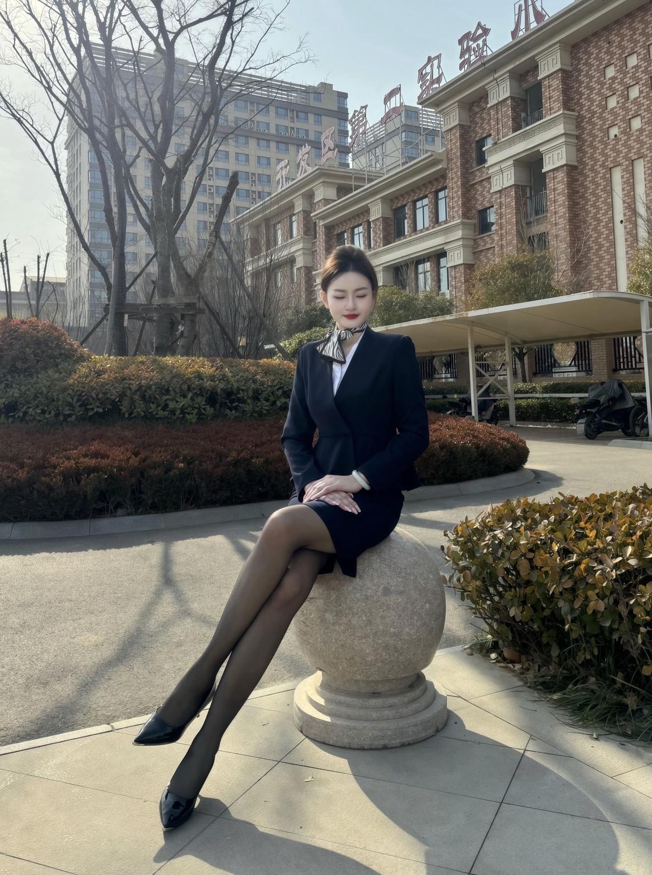 优雅空姐坐石球,城市背景显风范