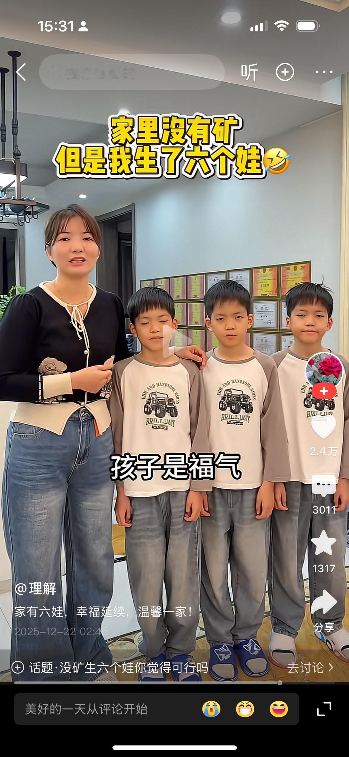 这个妈妈在网上晒他六个小孩,三个女儿三个儿子,她说她家里没有矿,但是她有六个孩子,孩子是福气,是生命的延续。我觉得这才是正能量的妈妈。我们现在社会上有很多不良的风气,什么丁克?什么为了小狗不生孩子?一个家庭如果没有孩子,家里面就没有了温暖,就没有了港湾,就没有了温度,就没有了希望。当家里面增加一个孩子的时候,我们的未来就充满了无限希望。支持这个幸福的妈妈。