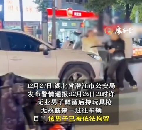 斑马线上持 “枪” 对峙越野车,看着惊魂动魄,真相让人又气又可笑! 12 月 26 日晚 21 时许,湖北潜江园林街道,一名无业男子喝得酩酊大醉,揣着一把玩具枪跑到街头斑马线上,无故截停一辆正常行驶的白色越野车。视频里黑衣男子气焰嚣张,举着枪状物死死对准驾驶室,吓得车主不敢轻举妄动,随后他还强行拉开越野车车门,场面看着极具冲击力,路过群众都捏了把冷汗。 事发后相关视频传开,大家纷纷揪心是否涉真枪,直到 12 月 27 日晚,潜江市公安局发布警情通报,才证实男子所持是玩具枪,其全程无故挑事,目前已被依法拘留。 真是酒壮怂人胆,拿玩具枪充大佬!斑马线本是行人安全通道,竟成了他撒野逞凶的地方,无故拦车挑衅,无视公共秩序更无视法律。醉酒从不是违法借口,玩具枪也不是嚣张资本,以为耍横没人管,殊不知法律面前,再荒唐的闹剧也有收场的时候。
