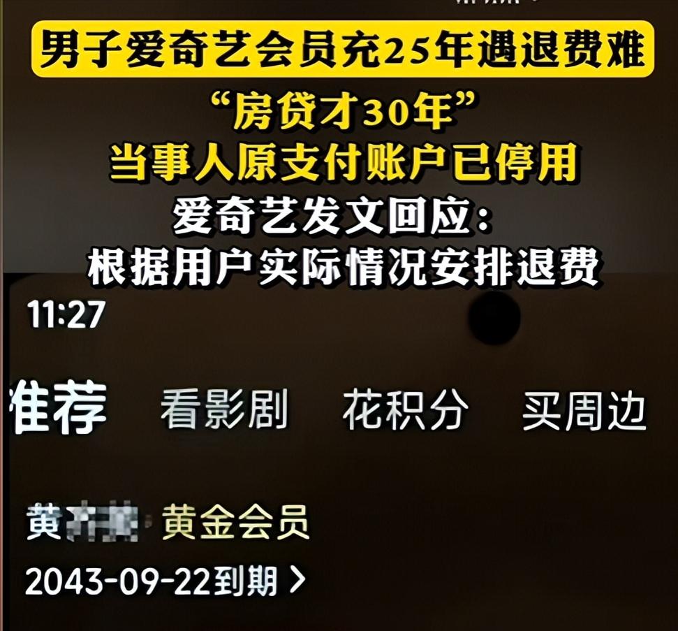 房贷未还完,会员先充到 2043 年!河南黄先生的遭遇,撕开平台充值容易退费难的遮羞布。 黄先生平日不追剧,账号交由家人打理,近期闲来看剧发现有广告,查会员竟惊觉已充 25 年。追问才知 2017-2018 年爱奇艺推优惠,99 元一年还叠加买赠,家人觉得划算,先后充 14 笔订单,硬生生续到 20 年后。 今年他已 50 多岁,直言谁能预料 20 年后变数,更憋屈的是会员仍有广告,热门内容还得额外花钱。他找客服退未消费费用,客服先允后拒,只给原路退回,可当年充值支付宝早已停用,还被他人注册,退款等于白送。反复协商无果,客服一味推诿扯皮。 12 月 25 日事件曝光,28 日冲上热搜,爱奇艺才慌忙回应,称核实账户同一人就妥善退费,还标榜重视用户体验。优惠时花式诱导充长期,退费时拿规则卡脖子,热搜倒逼才办事。 充值容易退费难从不是偶然,霸王规则凉了用户心,留住客靠的从不是套路,而是实打实的尊重与担当!