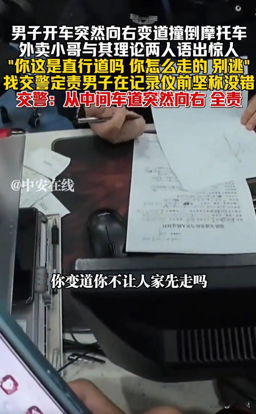 江苏,一外卖小哥骑着摩托车直行,突然一男子开着路虎向右变道撞上了摩托车,万万没想到,还没等小哥开口,对方却“先下手为强”,质问小哥是怎么开车的,小哥因为着急送餐,本来还不想计较,结果却被拦住报了警,交警一看:这不是你全责吗? 根据外卖小哥的行车记录仪显示,当时他正在直行送餐,左前侧的黑车突然变道过来,而且完全没有降速的意思,两车相撞后,小哥还算客气,说了句:师傅,你又转的时候看一眼啊 万万没想到,车里的两个人却不高兴了,主驾驶的男子说:什么右转看一眼啊?副驾的女子马上跟话:我们是正常行驶啊! 小哥表示自己是直行啊,看着送餐时间越来越近,小哥本想着理论两句就离开了,结果车上的两人却不让他走,想让他赔偿车子损失,并报了警 到了交通队,交警看了小哥的行车记录仪,询问车主:你从中间车道右转弯干嘛呢?你右侧有车辆啊,转弯看一下啊,你变道不让人家先走吗? 即便说的如此明白,车主依旧嘴硬,还说自己已经停下了,要不就把他撞到了,并询问这个事责任如何划分 交警直接回应:你所谓的停车,是发生碰撞以后才停的,这个交通事故就是因为你变道,肯定你全责啊 有网友说,有些司机连基本的交通规则都不清楚,驾照怎么考的?随意变道、突然转弯,出事了还强词夺理,这种毛病真该改改 变道让直行是最基本的交通规则,但很多司机在实操中容易忽略。有时候是心急,有时候是习惯不好,总觉得“我打灯了”“我慢慢靠过去了”,别人就应该让我。但规则的核心是安全,变道的前提是不影响其他正常行驶的车辆 这一幕其实挺现实。很多人开车时间一长,就容易把车当成理所当然的地盘,方向盘一打,默认别人得躲。尤其是遇到电动车、摩托车、外卖骑手,潜意识里就觉得对方好欺负、好说话,先声夺人反而能占便宜。可问题是,交警和监控不看你声音大不大,只看谁违章 我想说,不管开什么车,上路都要守规矩、讲安全。规则不是针对谁的,而是为了保护每一个人。别觉得自己开好车就有底气,也别因为赶时间就忽视安全。路上互相让一让,事故少一点,大家心情也顺畅一点