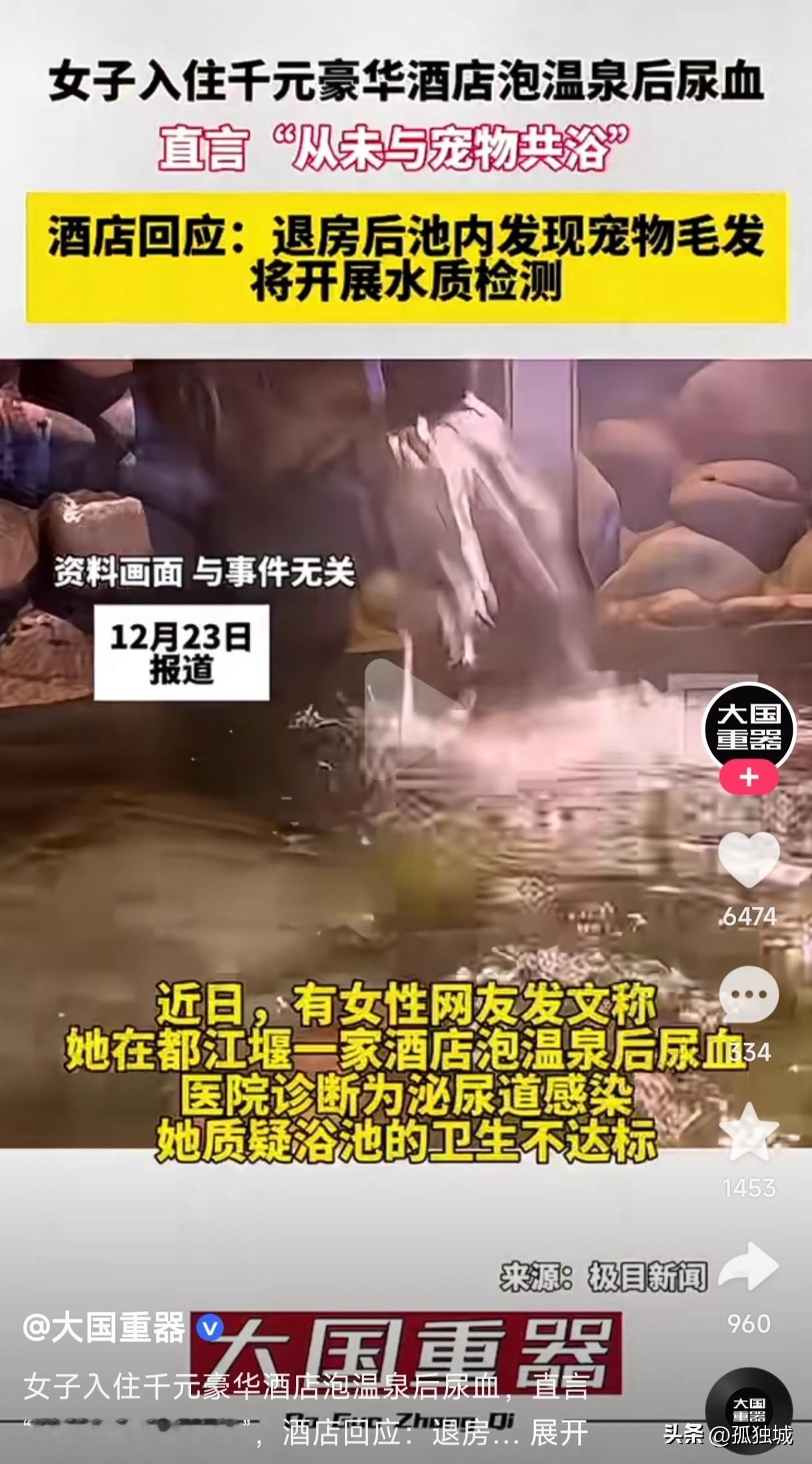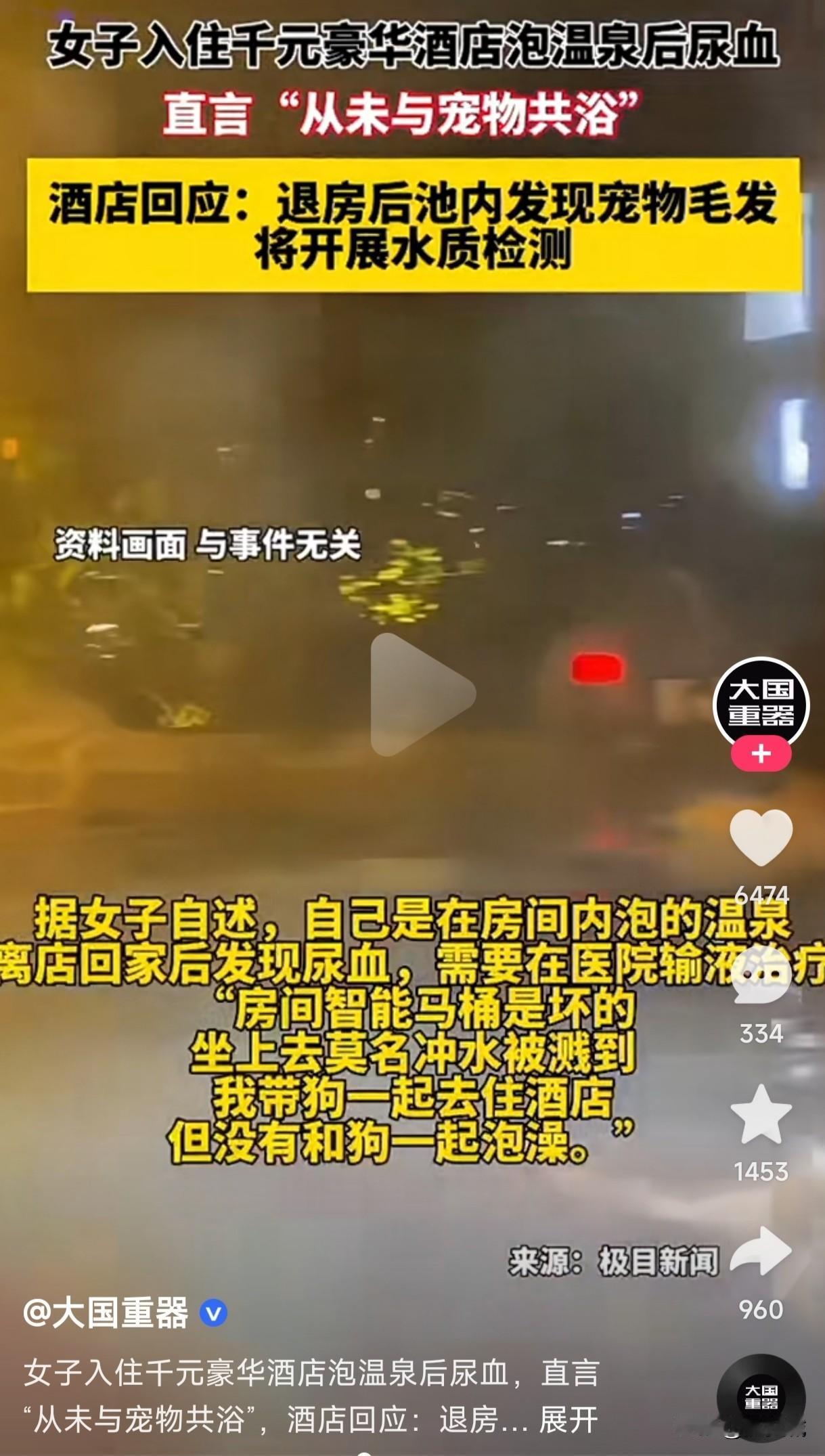 女子带宠物狗入住千元豪华酒店泡温泉,离店回家后发现尿血,她质疑酒店浴池的卫生不达标,酒店回应退房后池内发现宠物毛发将开展水质检测。 这婆说婆有理公说公有理的说法,到底哪方面的说辞才是真实的,按理说酒店的浴池都是单独使用的,并且客人退房后也会及时消毒打扫,这卫生不达标的几率是不是很小,况且酒店在客人退房后发现浴池里有宠物的毛发,但女子却说自己并没有和狗一起洗澡,而且她自己回家后尿血去医院检查诊断是尿路感染。 这女子的意思是酒店卫生不达标导致自己尿路感染尿血给她赔偿医药费,而酒店说是女子和狗一起洗澡导致的,但女子说自己是带狗一起住酒店了,但没有和狗一起洗澡,这到底哪方说的是真的呢?