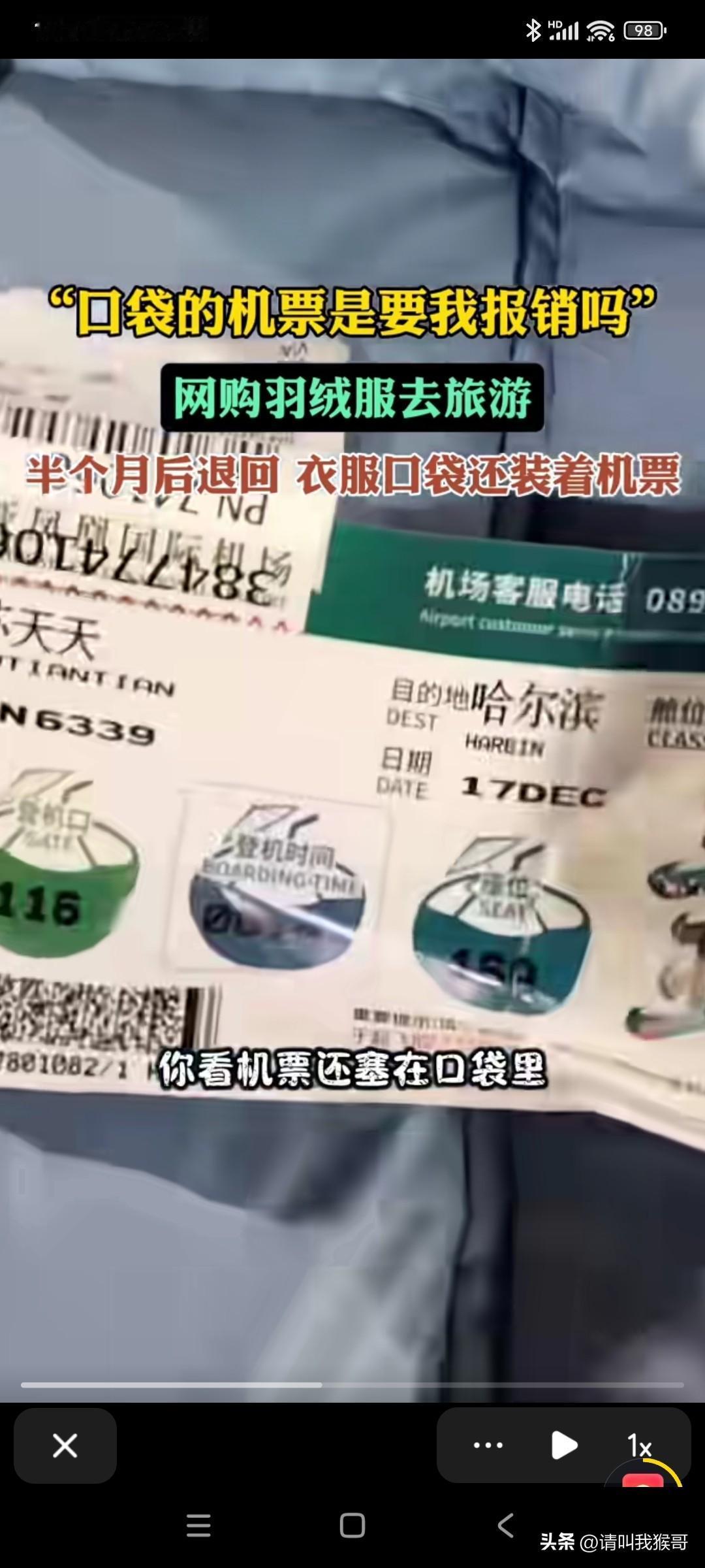 近日一网店老板吐槽,一位海南的顾客网购了他店子里的一件羽绒服,退货时吊牌未剪,口袋里还有一张到哈尔滨的机票。估计这顾客是打算去哈尔滨玩,提前买件羽绒服备着,结果玩完回来就给退了,退回的衣服上还有许多油污,让店老板很是无语。 前段时间还有个店主爆料称,顾客退回的裤子口袋里竟然还装着妇科检查的单据。这两年钻“七天无理由退换货”规则空子的人太多了,很多店老板在吊牌上下功夫也无济于事,诚信经营不仅仅是销售方的事,也是我们购买方的事。对于这种喜欢占便宜的人,网购平台真的应该想个办法制止,不然这种人最后会把网购环境弄坏的。