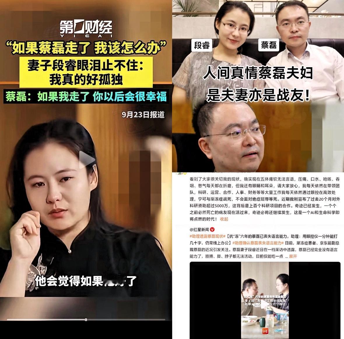 现在估计最开心的就是蔡磊的老婆段睿了! 没想到蔡磊真的成功了! 这哪是对抗病魔,分明是用生命在“创业”——确诊六年,从商界大佬变成只能靠眼控仪交流的病人,他砸了超一亿,拉着上百位科学家推进近300条药物管线。 老婆段睿放下一切转行直播筹款,夫妻俩一个在科研前线死磕,一个在直播间为希望输血,这种双向奔赴的坚持,比任何奇迹都动人。 现在部分基因型渐冻症被攻克,20多岁患者能恢复正常生活,这不仅是他们的救赎,更是千万患者的光。 其实蔡磊的胜利,早就超越了治病本身,他证明了普通人的坚持,真的能撬动医学的壁垒。