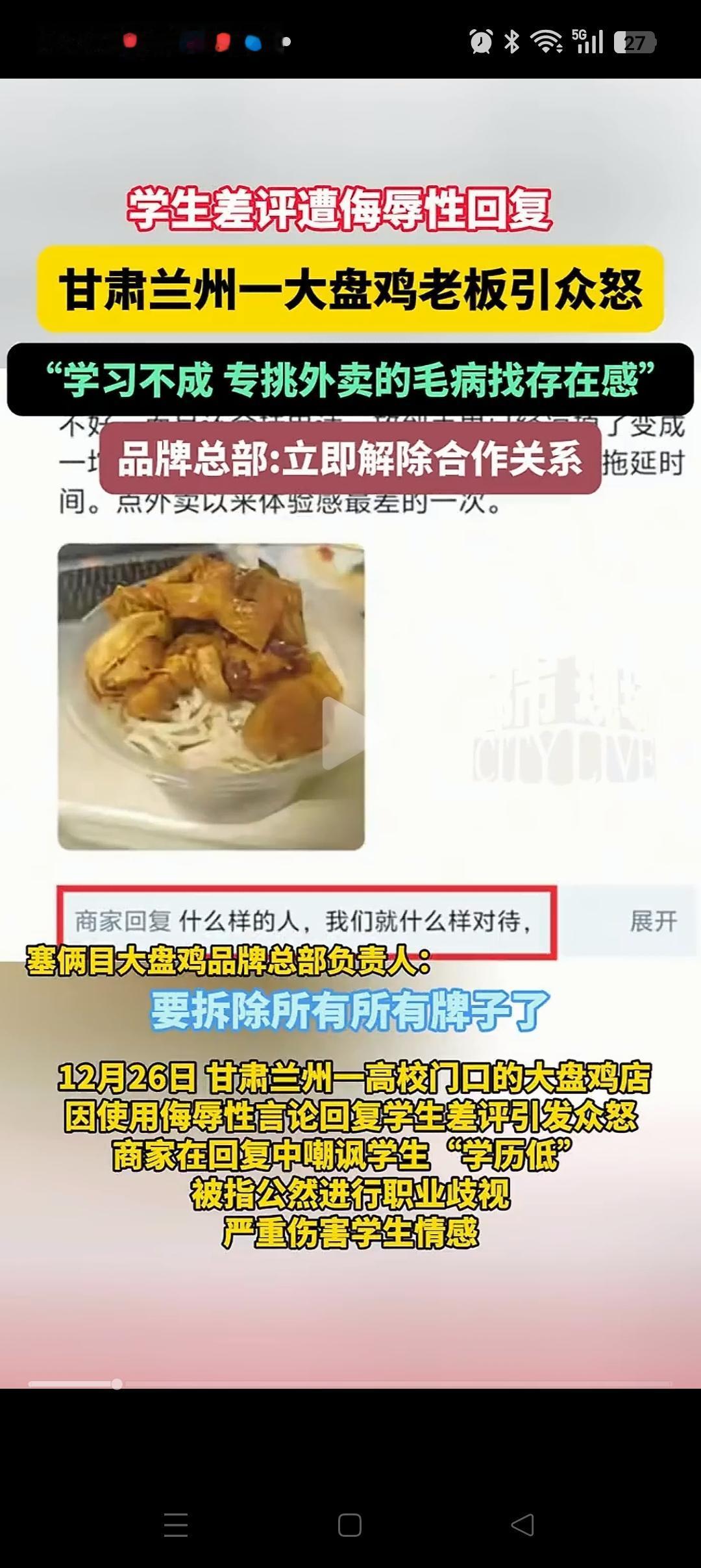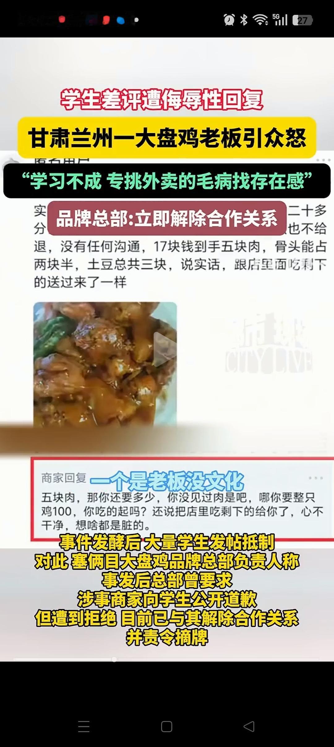 “这老板一点不冤”,甘肃兰州,一大学生点了一份大盘鸡,因外卖迟到了20分钟,份量又少,便给了差评!没想到等来的不是老板的道歉,而是冷嘲热讽,说:学习不行,将来毕业了就去电子厂报道吧。 作为商家,有时候餐期忙可以理解。你跟客户解释了,有人愿意包容是好事。但是你送晚了别人给个差评也正常,没必要这么冷嘲热讽的。 本来诚恳的道个歉就完事了! 这下好了,不仅全国都知道了,还被大盘鸡品牌总部要求关店,损失估计有小20万了。 不过我看老板过往跟学生的评论,基本每个差评都要怼回去。现在这个局面,也可以说一点不冤,该。。