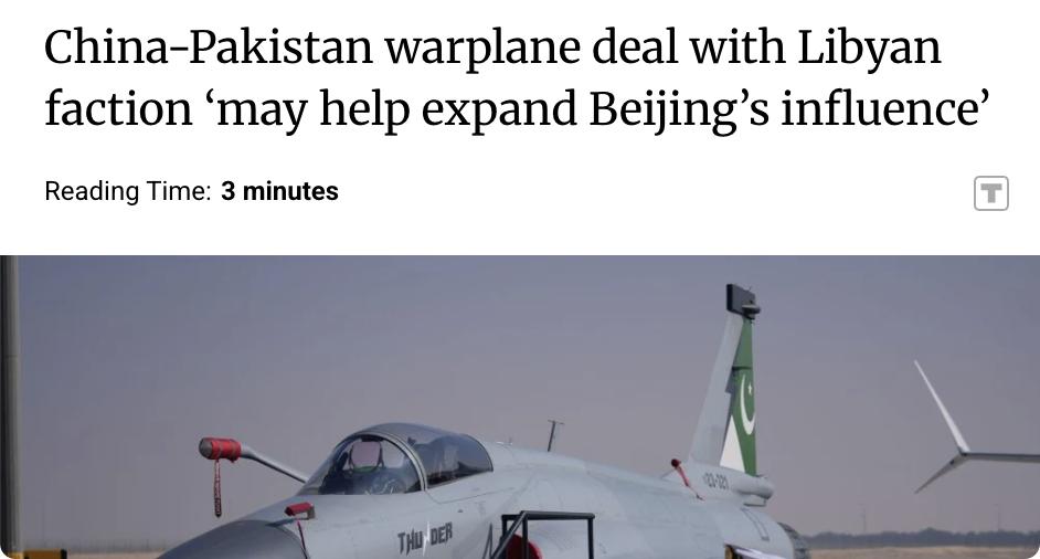 外媒:巴基斯坦正向利比亚国民军(LNA)出售与中国联合研制的JF-17“雷霆”战斗机,分析人士认为,此举可能成为中国扩大在北非地区影响力的切入点。 这是巴基斯坦史上规模较大的军售之一,交易总额超过40亿美元。 JF-17此前已出口至缅甸、尼日利亚和阿塞拜疆。美国五角大楼最新报告指出,JF-17已成为全球市场上销量最高的中方设计固定翼战机之一。