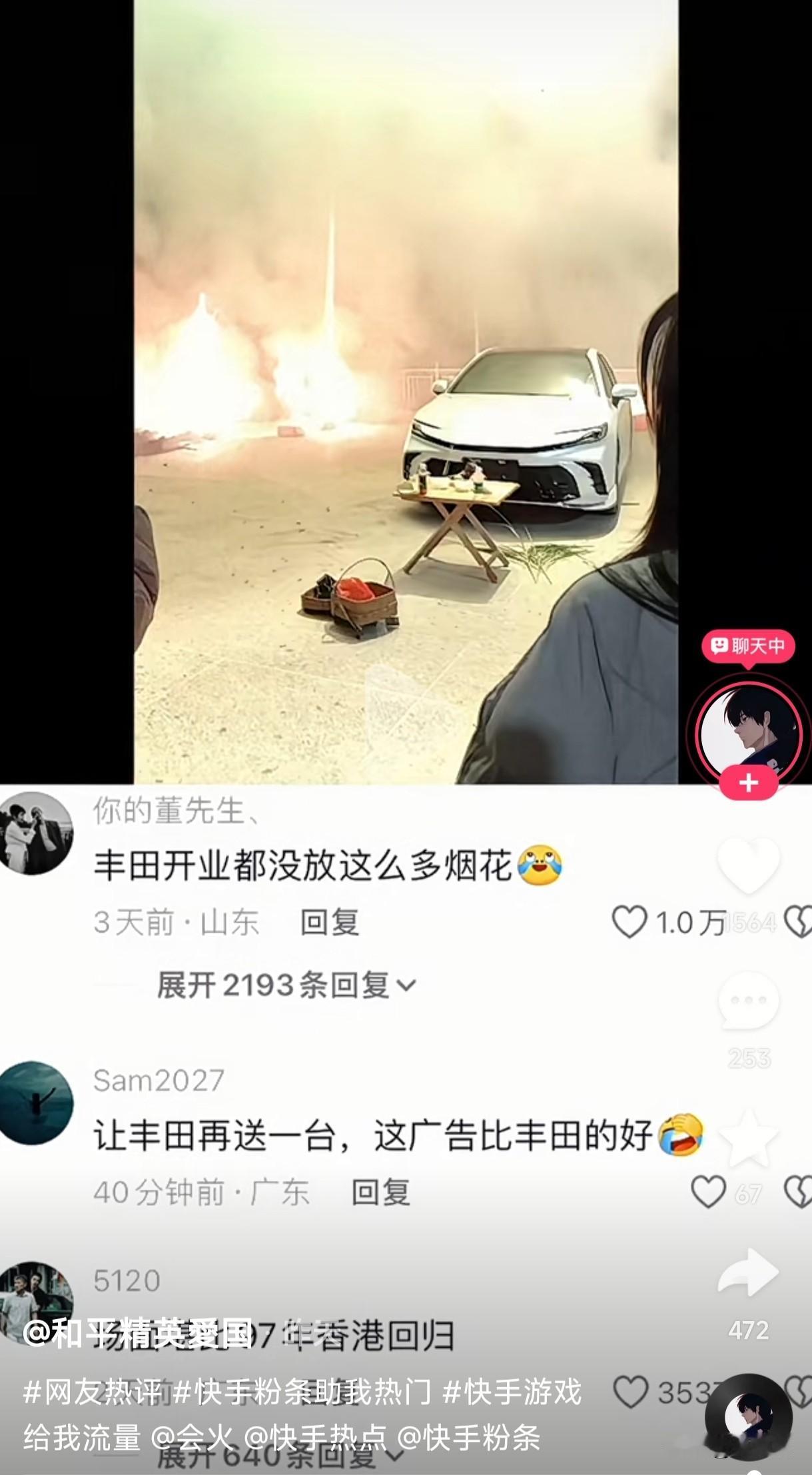 普通男人三大成就必须少不了放烟花爆竹庆祝 第一是娶老婆 第二是买房 第三就是买车 这三件喜事对于普通男人来说是这一生最有成就感的美事了,就如这位网友买了心爱的车放烟花爆竹庆祝一样,有网友说这阵势可能丰田当初开业的时候都没有这么多烟花,他这阵势既是为自己买车庆祝,也是在为丰田打广告,应该让丰田厂家在送他一辆车。 这庆祝方式确实让人开眼了,几十万的车是不是要几万块钱的烟花爆竹了?
