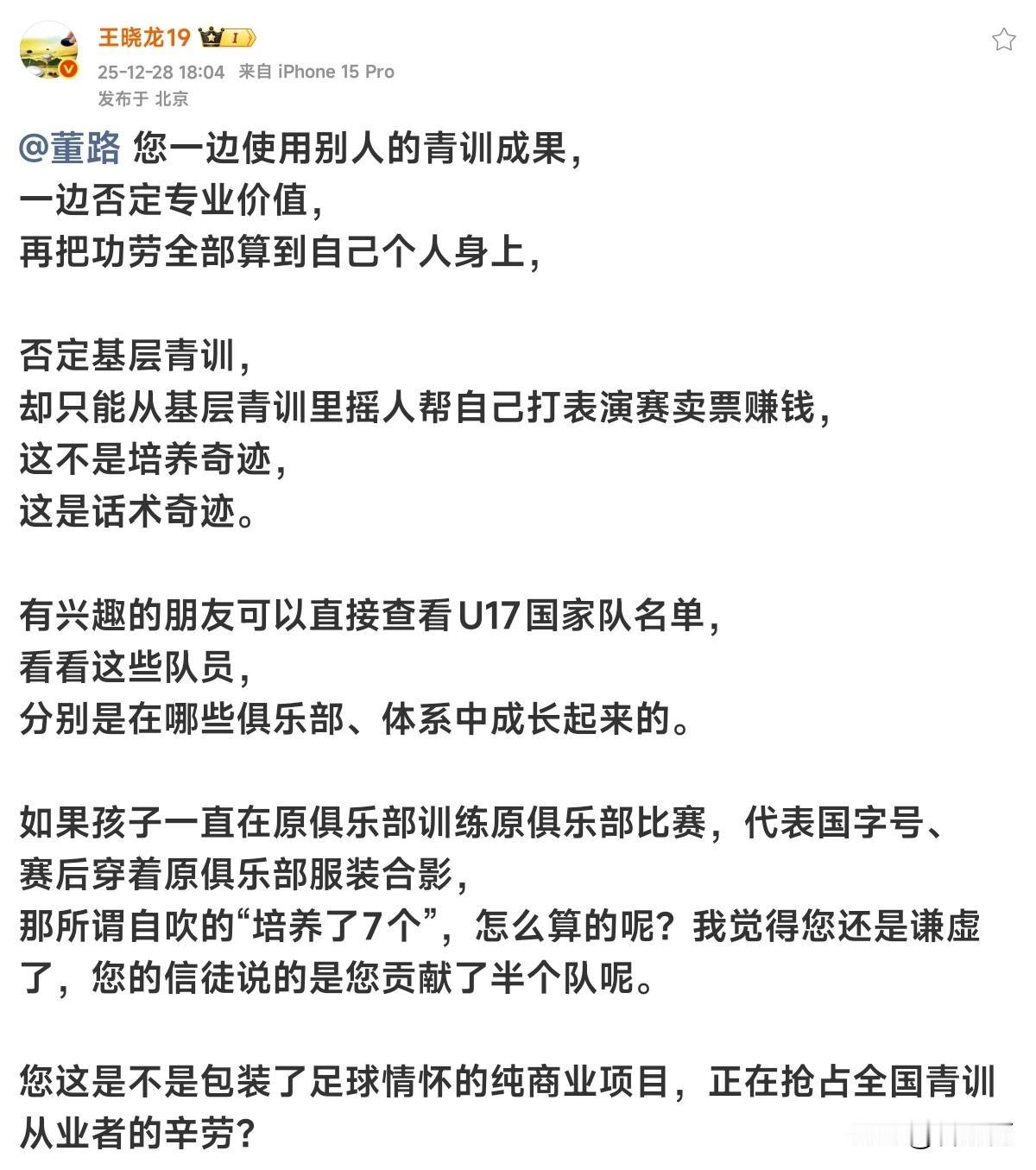著名青训教育学家董路老师和前国脚王晓龙之争又开新篇章,从过去的青训理念到一名球员如何算是某个教练培养的! 董路老师在某个项目推广时做了一个PPT,其中有一篇是说U167国家队里7名核心球员出自足球小将。 王晓龙质疑这7个数字过于夸张,从国少队的名单看没有一个是来自足球小将。 而潘伟力说过国少队满打满算只有一个邝兆镭算是董路老师培养的,其他三名来自清华附中的球员,董老师只带了三年,而清华附中的韩国级教练也带了三年,另外万项只在小将待了一年,其余都6年在湖北星辉,1年在重庆足协。 有球迷认为 邝兆镭、南子勋、周雨诺、赵松源、万项、张博霖、李均鹏、谢晋这八名球员都代表小将踢过球,都得到过董老师的教诲。 那么如何定义一名球员是某个教练培养的呢,拿武磊张琳芃等崇明岛一期球员为例,徐根宝带他们将近10年,他们是徐根宝培养的没人怀疑。 一名球员从8岁开始到18岁成人,带过他们的教练一般有几个,那么带多长时间才算某个教练培养的呢?