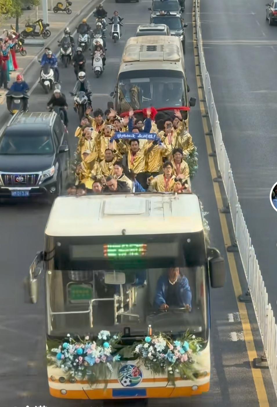 永州大巴巡游挺厉害的,这应该是国内首次真正意义的花车巡游。 公交车临时把上层截断,太牛逼了! 而且全市巡游,整个永州都在看。 中超球迷都羡慕吧,明年其他省超球队也想夺冠,也想当冠军城![灵光一闪]