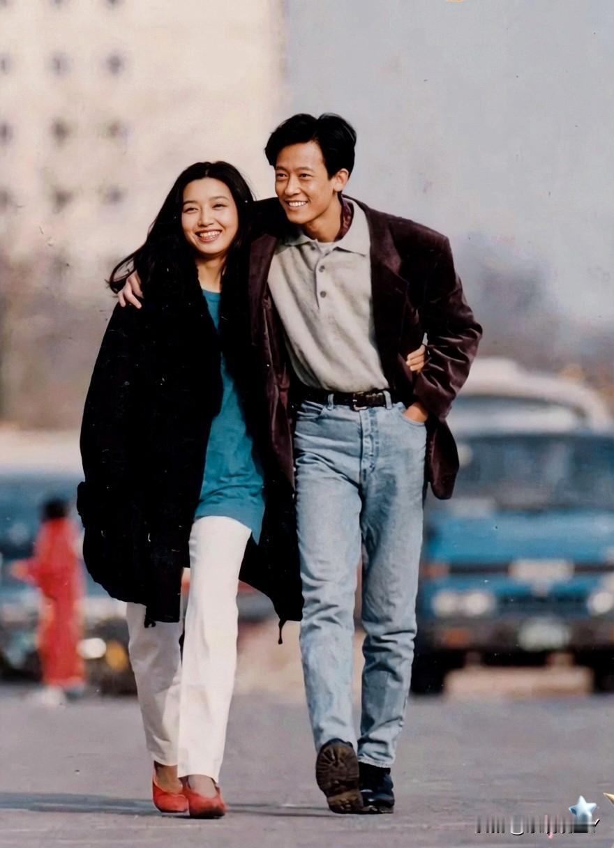 一九九三年,洒脱帅气的王志文和美丽大方的江珊在北京大街上留下的一张合影,彼时王志文二十七岁,江珊二十六岁。照片中王志文手臂搭在江珊肩上,江珊搂着王志文的腰,两人均面带微笑,神情放松愉悦,画面也十分的温馨。