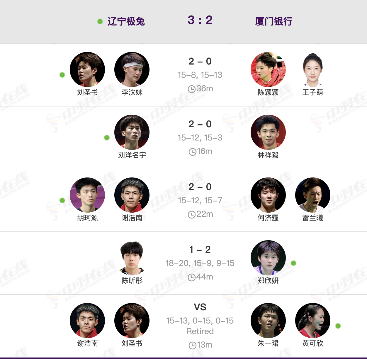 羽超联赛【2号场地:辽宁极兔 3-2 厦门银行】1、刘圣书/李汶妹 15-8、15-13 陈颖颖/王子萌2、刘洋名宇 15-12、15-3 林祥毅3、胡珂源/谢浩南 15-12、15-7 何济霆/雷兰曦4、陈昕彤 18-20、15-9、9-15 郑欣妍5、谢浩南/刘圣书(退赛) 15-13 朱一珺/黄可欣