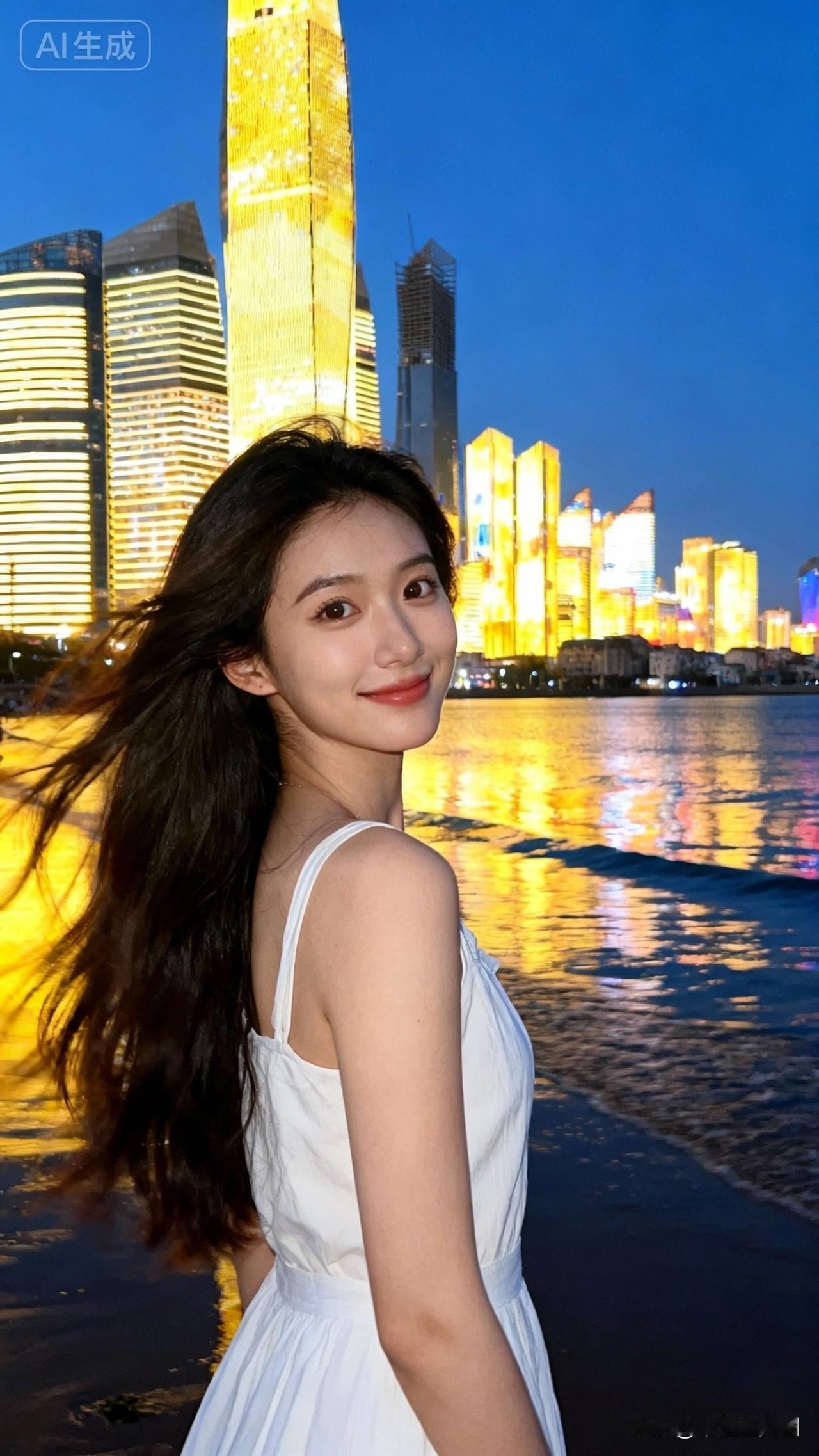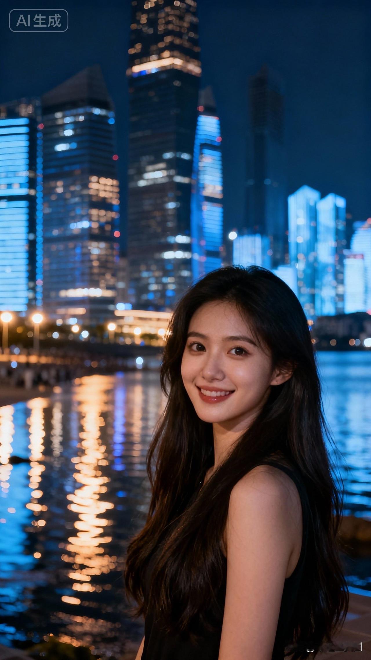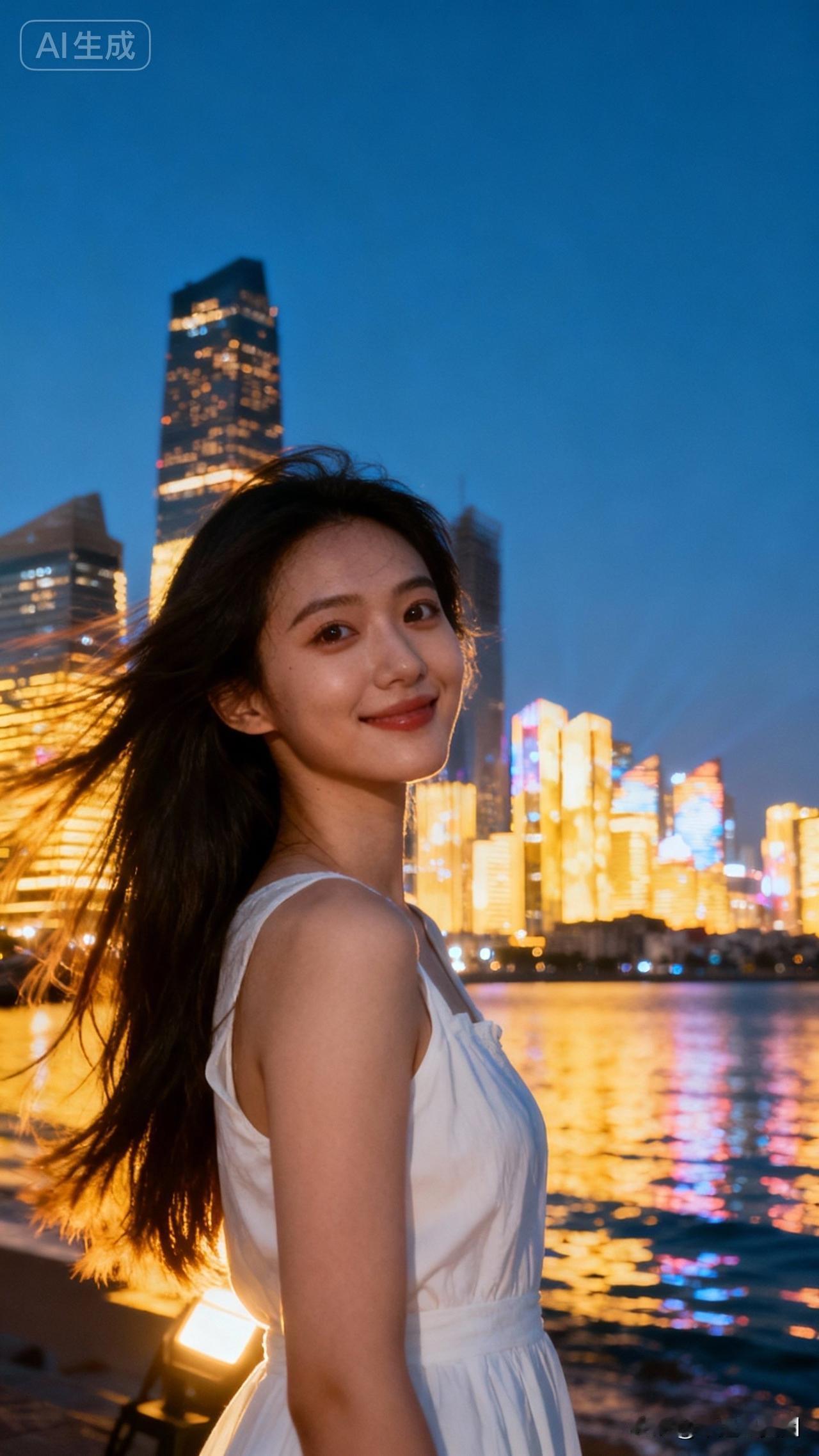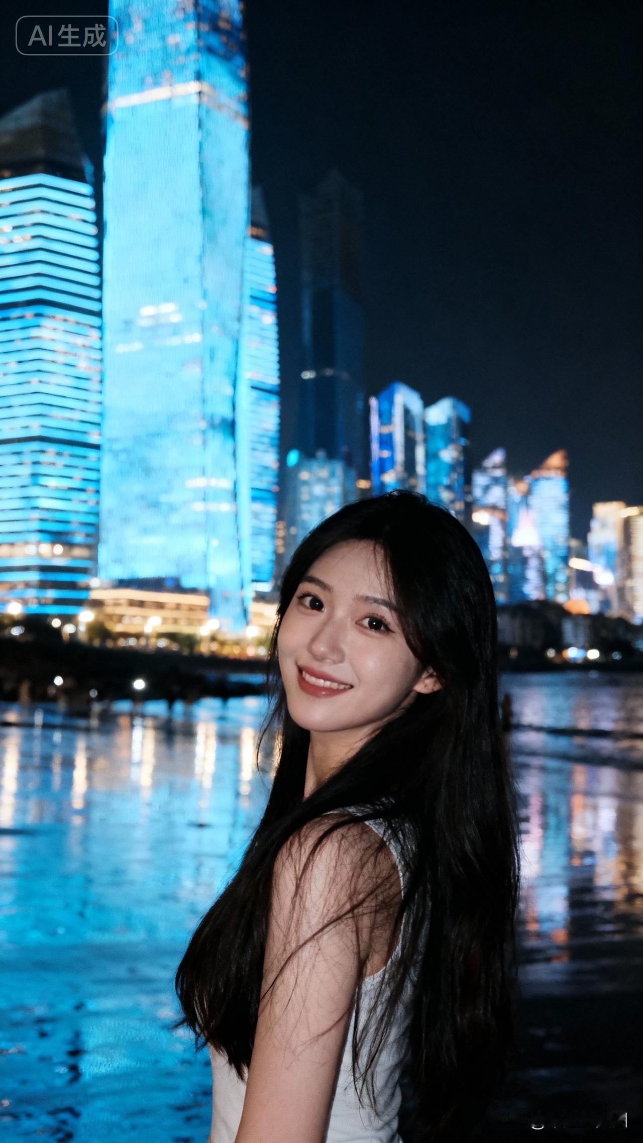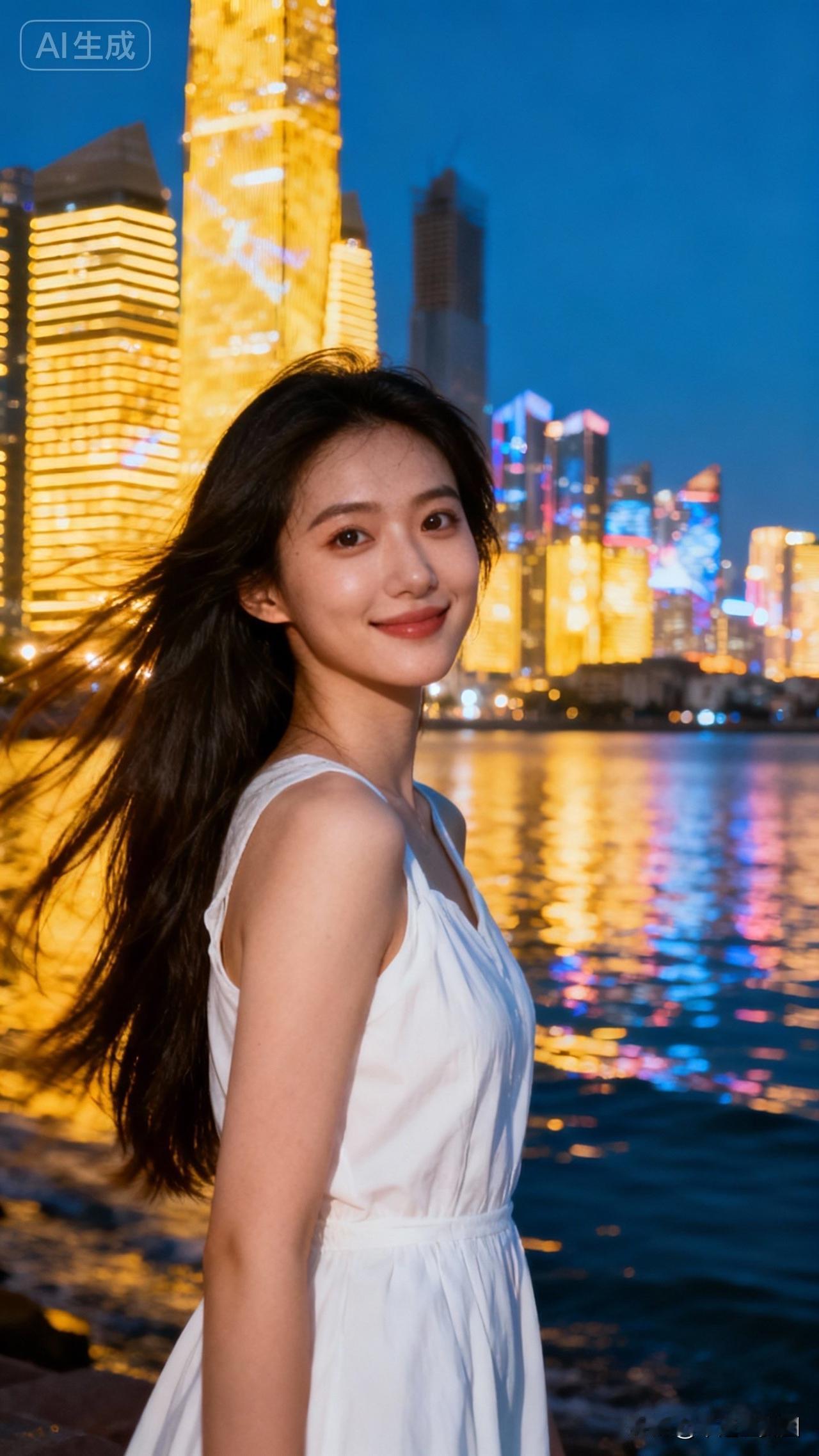夜晚的都市风光,少女微笑面对镜头,灯火辉煌,浪漫迷人。